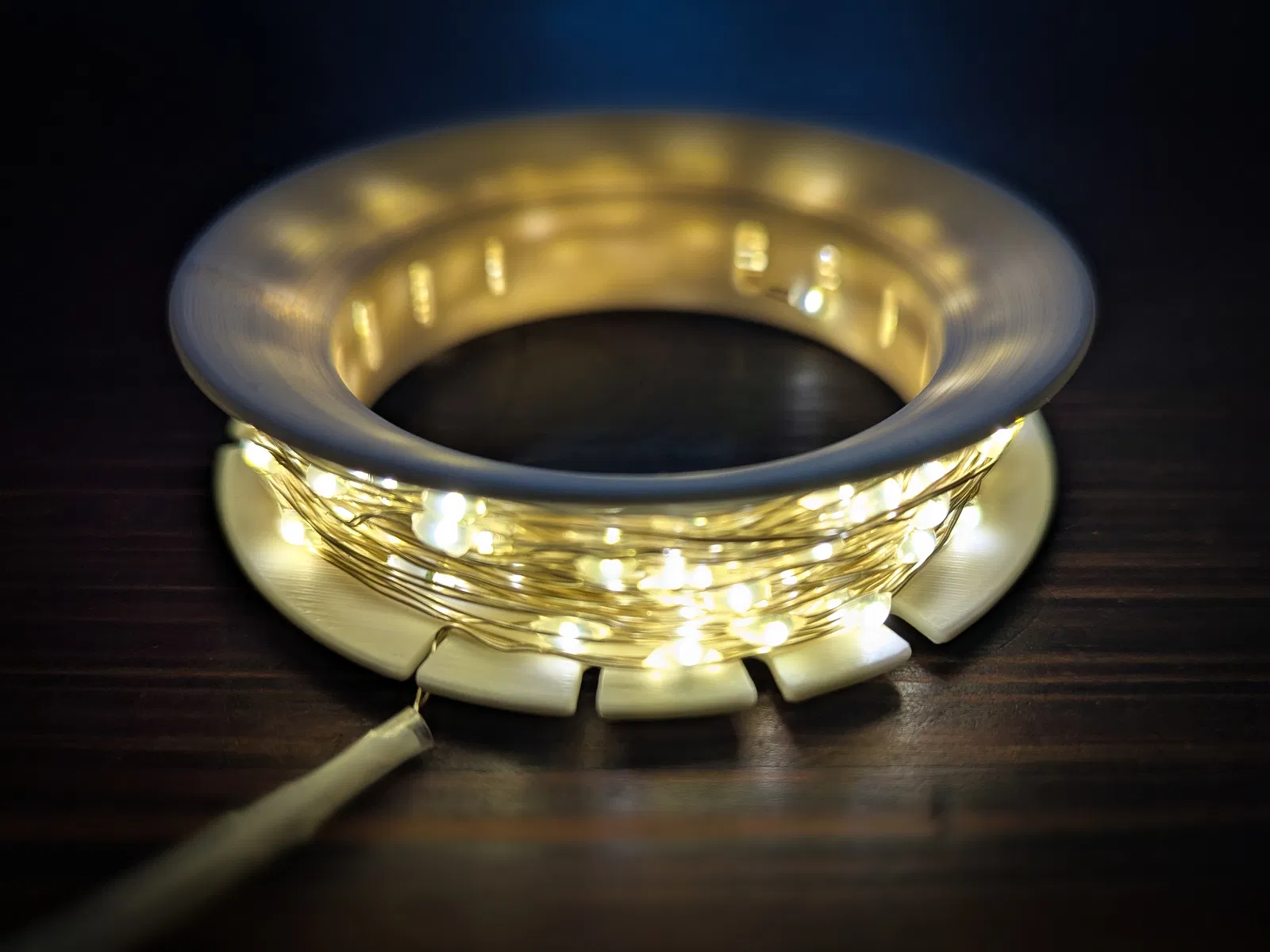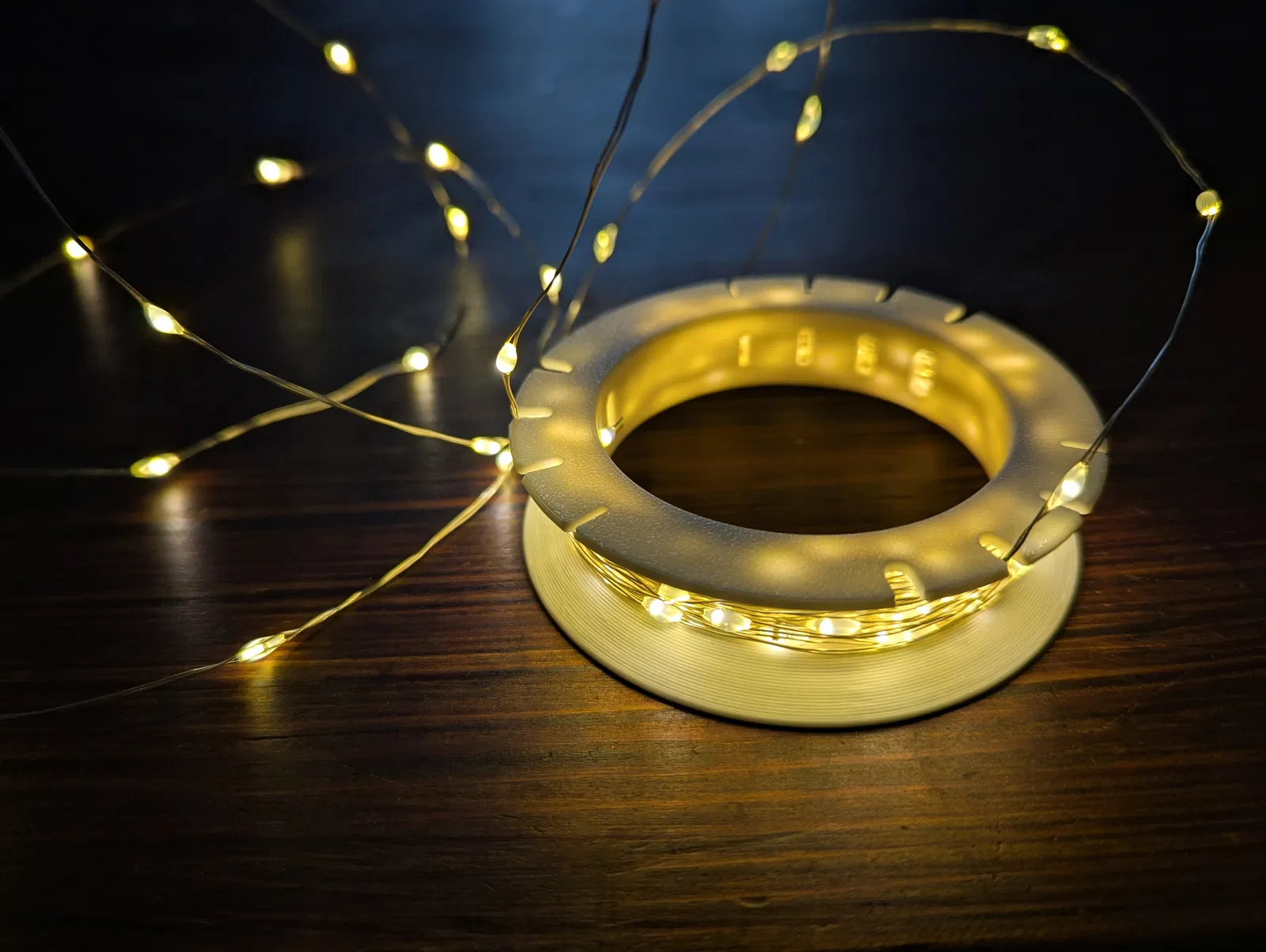 Cuộn (spool) nhỏ gọn để quấn/tháo dây đèn fairy lights không bị rối, có lỗ nhiều cỡ để cố định 2 đầu dây. Đường kính 80 mm, cao 20 mm, chứa tới 20 m dây mảnh; in không cần support, khuyến nghị 100% infill.