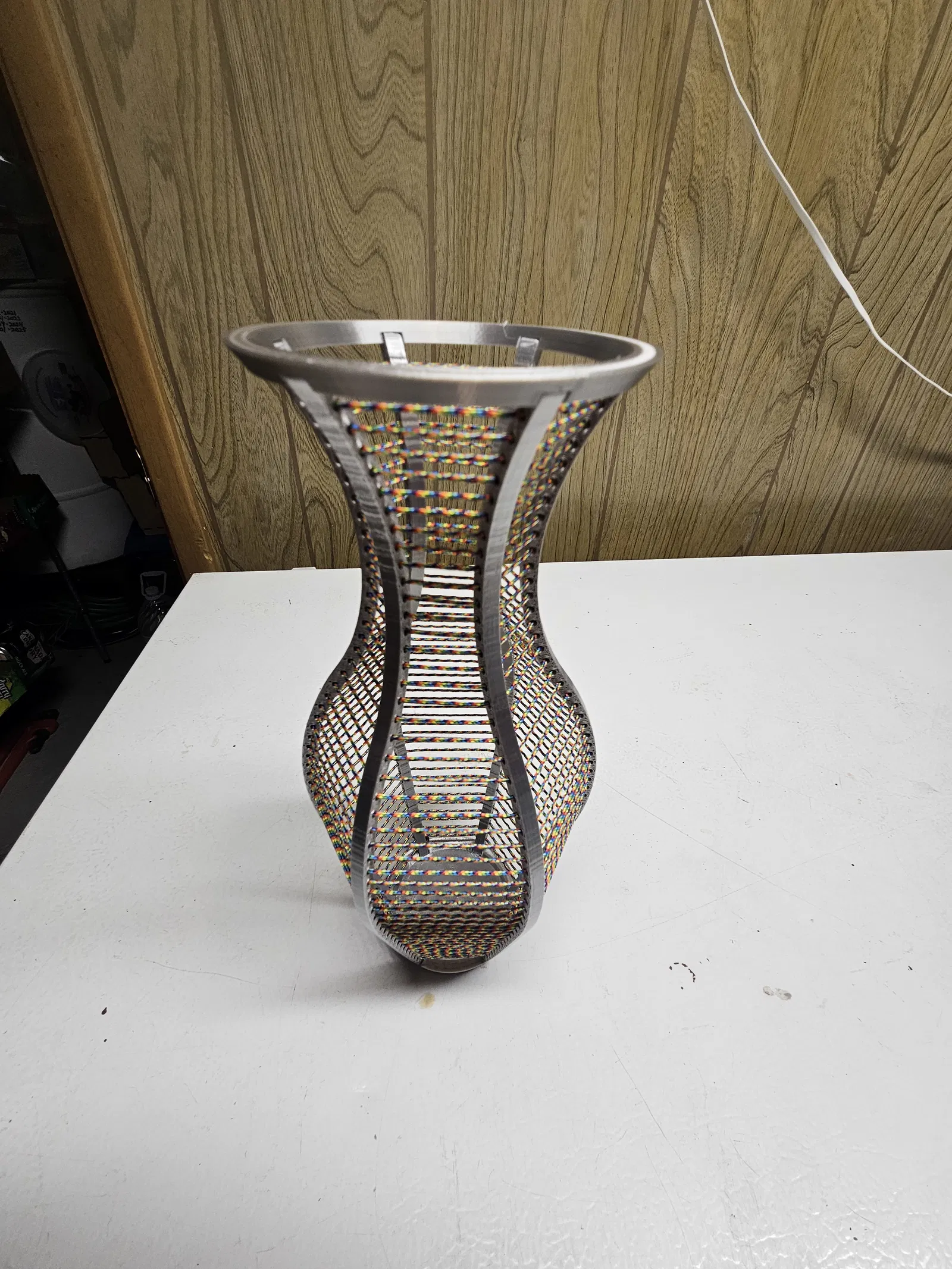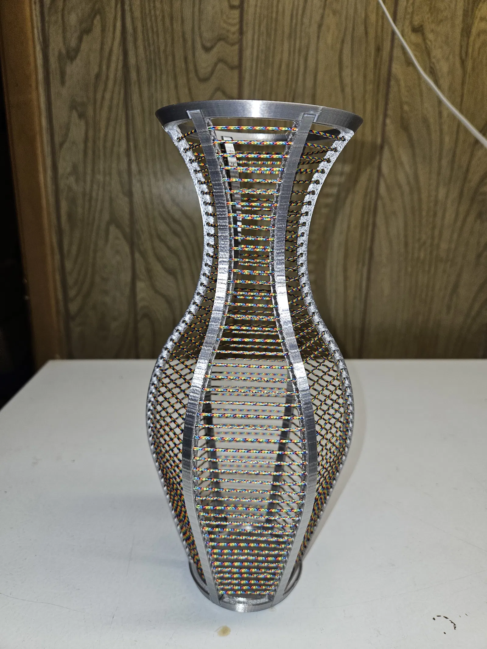 Bình trang trí dạng khung để quấn filament hoặc dây (string) xuyên qua các lỗ. In từng phần rồi dán lại, hoặc in nguyên khối nếu muốn thử thách. Dùng khoảng 12,7 m filament; không đựng nước, hợp trưng hoa in 3D/Lego.