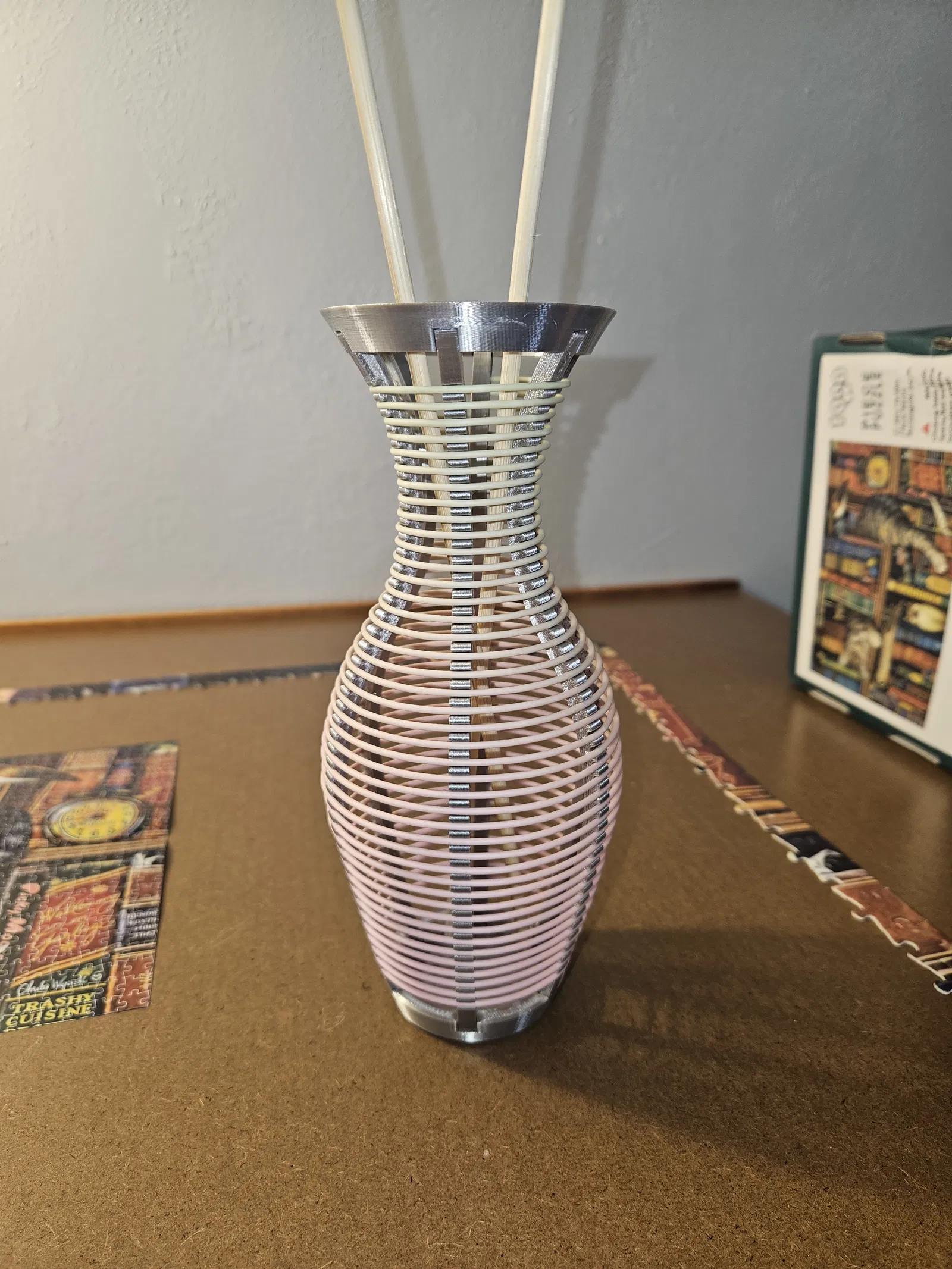 Mẫu bình hoa tạo hình bằng cách in khung rồi quấn filament từ cuộn quanh các gân. Có thể in nguyên khối hoặc in từng phần để dán lại. Dùng khoảng 10,3 m filament, phù hợp trưng hoa in 3D/Lego, không chứa nước.