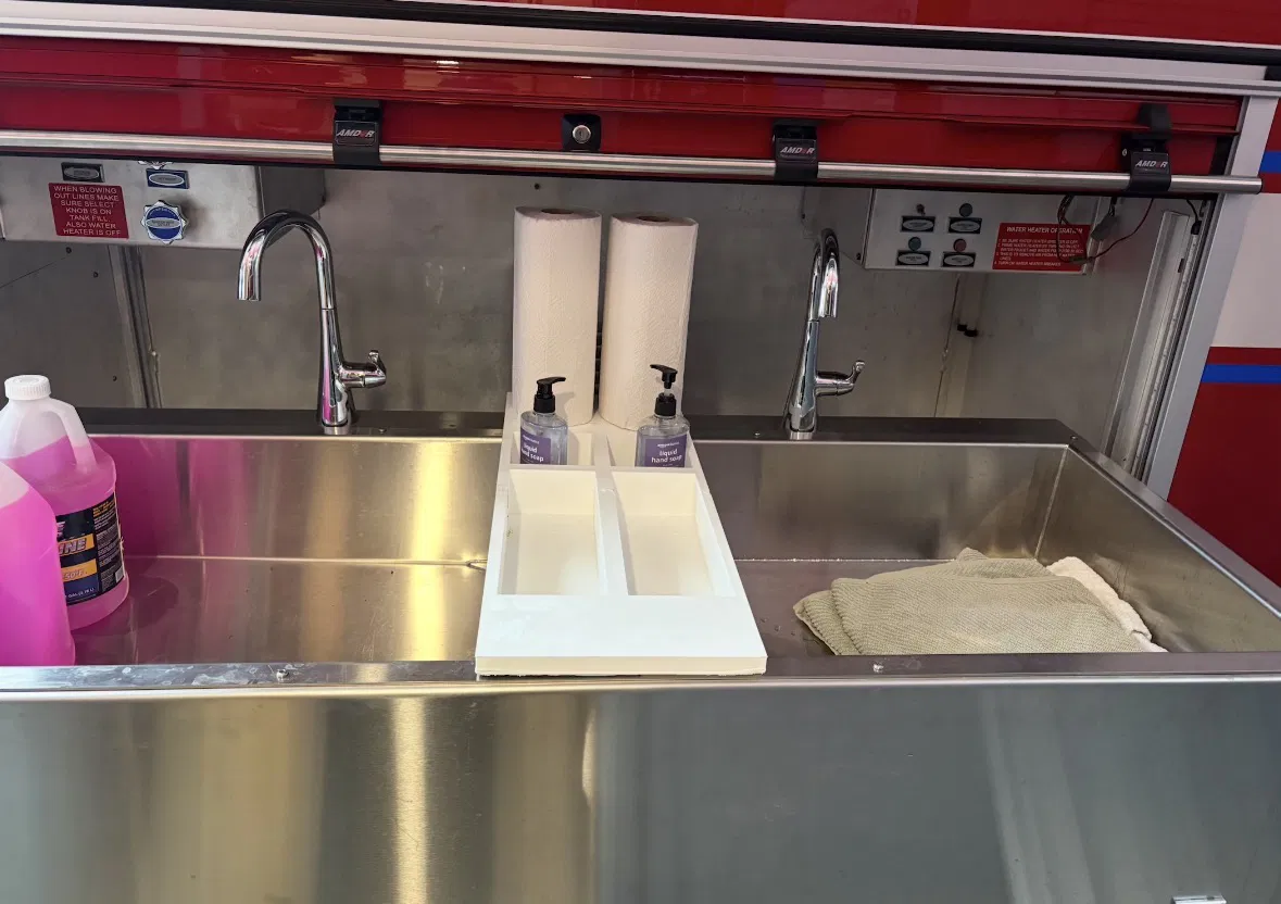 Khay organizer cho bồn rửa của rehab unit bên đơn vị cứu hỏa (hoặc RV có bồn tương tự). Giúp có chỗ để xà phòng, giấy lau tay và vật dụng cần quanh bồn rửa. Có kèm phác tay và kích thước.