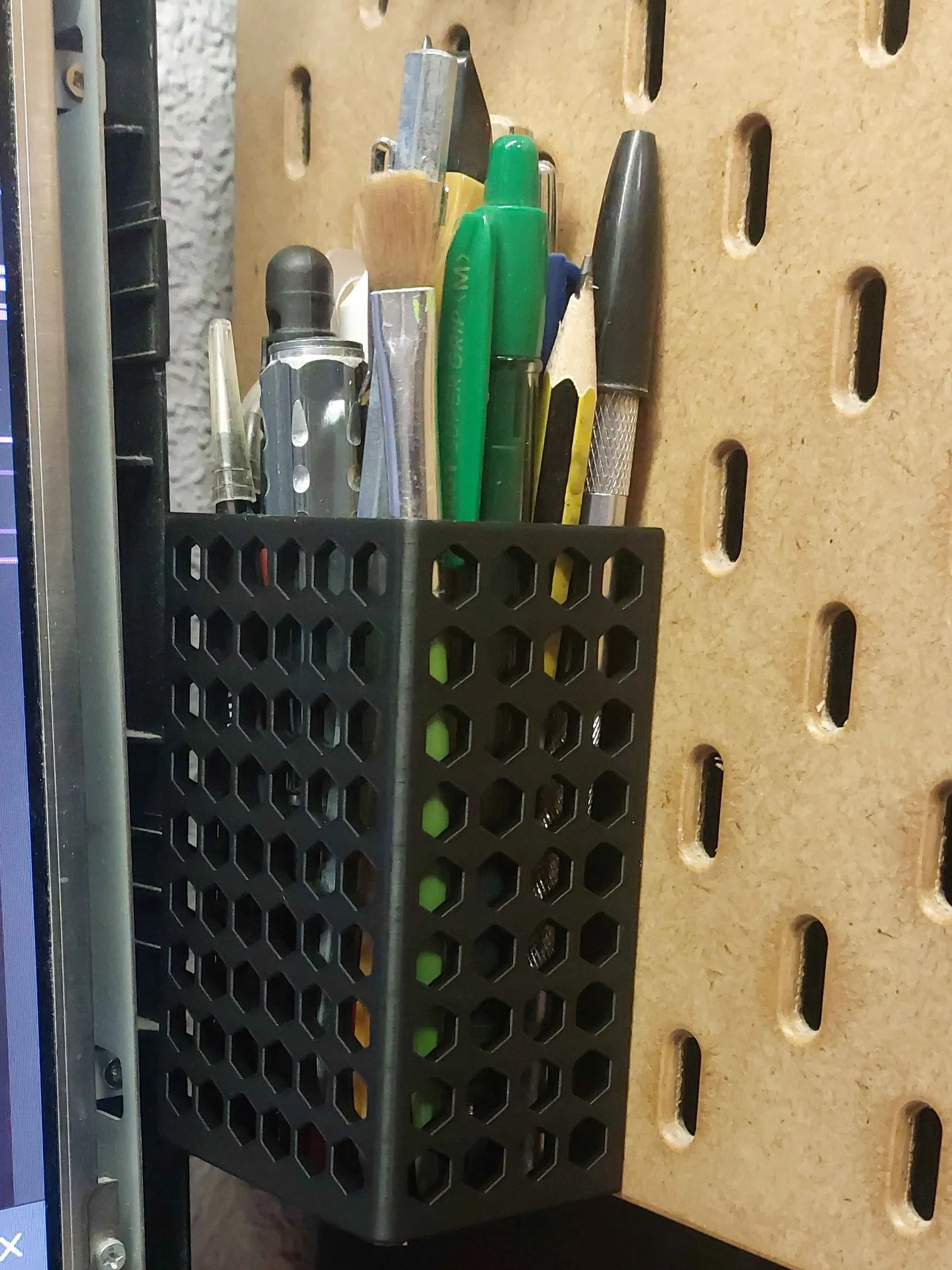 Phiên bản ống đựng bút nhỏ do mình tự thiết kế cho bảng Skadis, ưu tiên kiểu dáng gọn, không thò ra nhiều. Vị trí móc được canh để khi cần có thể đặt sát (flush) với cạnh dưới của tấm bảng.