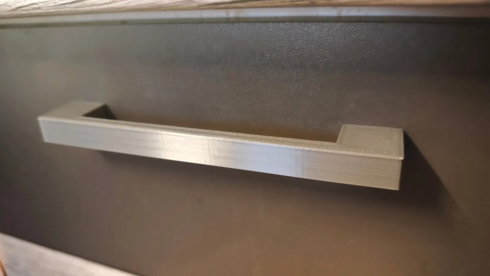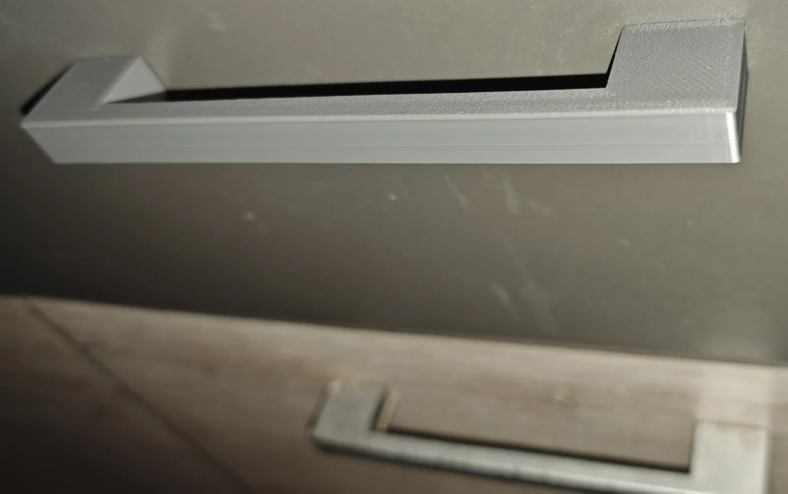 Tay nắm tủ tối giản cho ngăn kéo tủ bếp, dùng để thay tay nắm bị hư. Thiết kế tối ưu cho 3D printing, in sạch không cần support. Khoảng cách lỗ 127 mm, dùng vít M3.