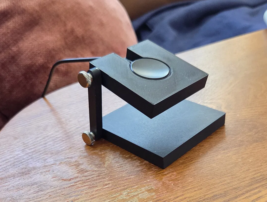 Mẫu dock sạc giữ Samsung Galaxy 7 Watch bản 40mm chắc chắn khi sạc. File 3MF “Slicer” có thêm mesh tăng infill để gia cố chỗ lắp brass threaded inserts; khoan lỗ 4mm và ráp bằng ốc M3 knurled.