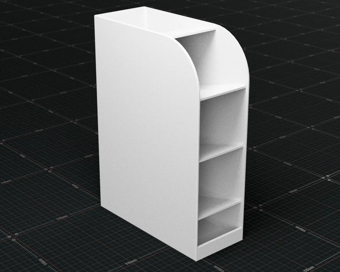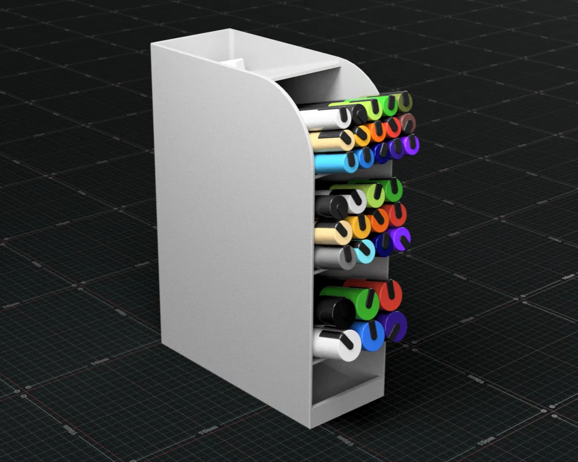 Kệ đựng marker/bút dạng dọc phong cách tối giản, gọn chỗ và dễ lấy. Các tầng nghiêng giúp nhìn rõ từng cây, phía sau có ngăn cho đồ cao hơn. Có 3MF để in nhanh và STEP để remix.