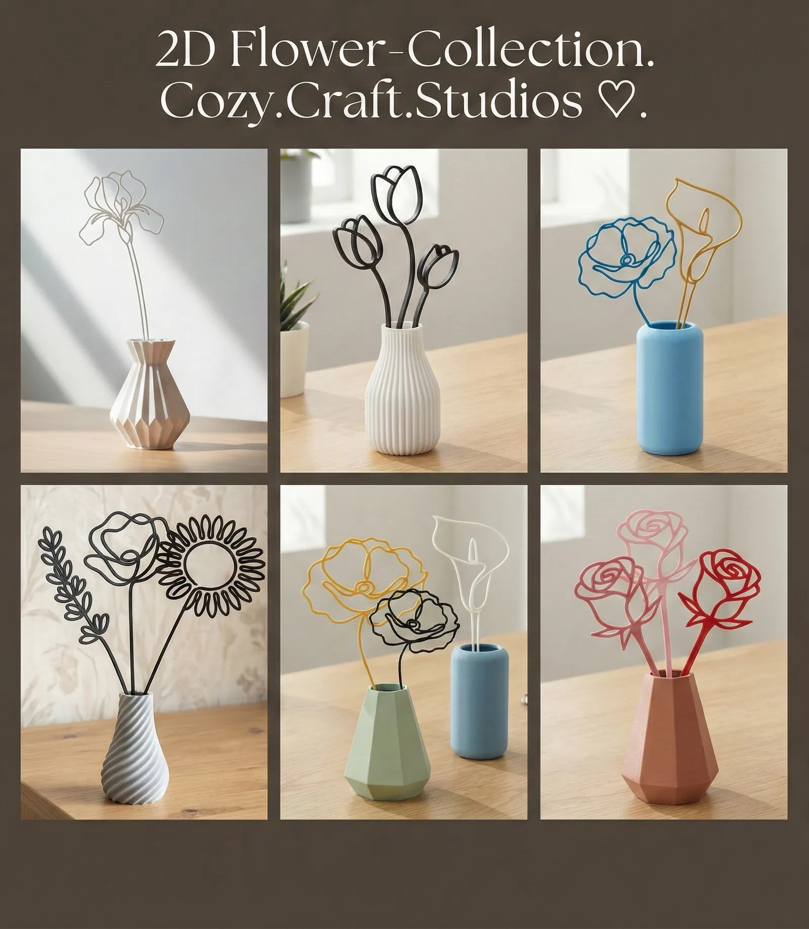 Bộ 2 hoa hồng dạng line art tối giản, sang và hiện đại để cắm bình, trang trí hộp quà hoặc làm điểm nhấn chậu cây. Tối ưu FDM, in PLA không cần supports, mặc định 180mm và có thể scale theo kích thước bình.