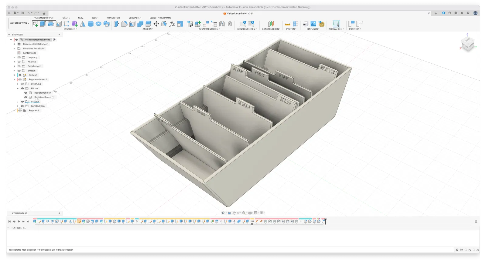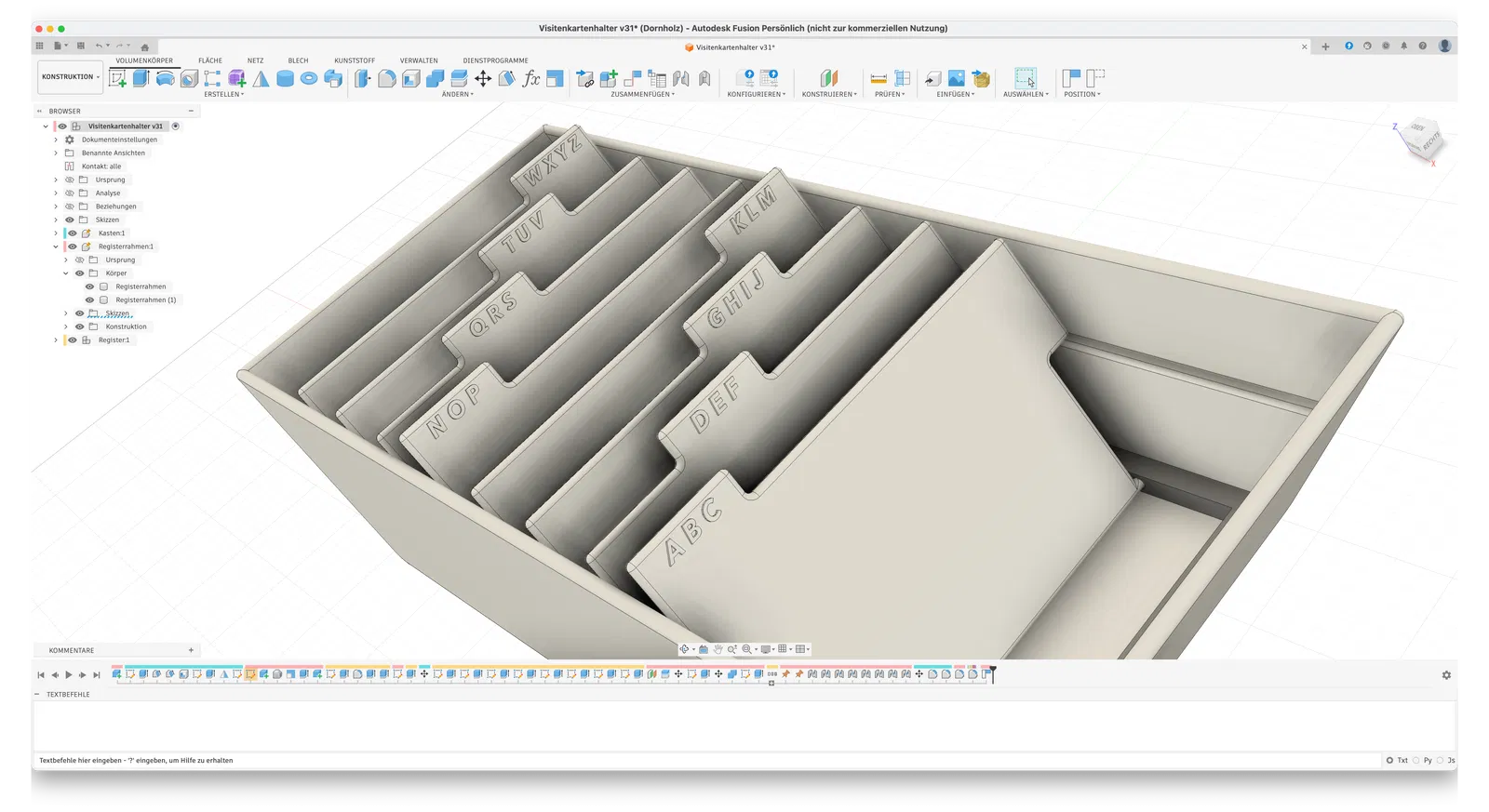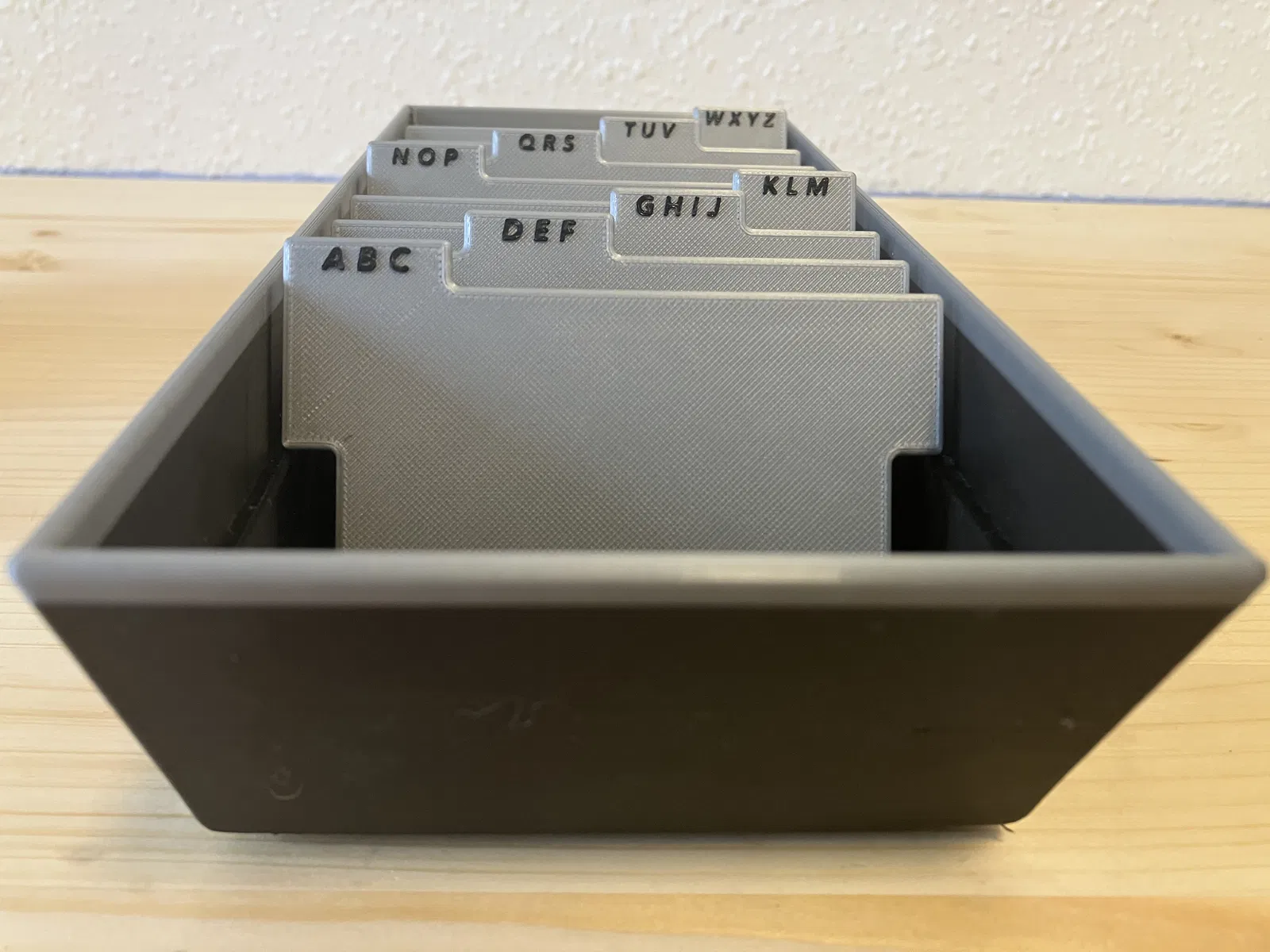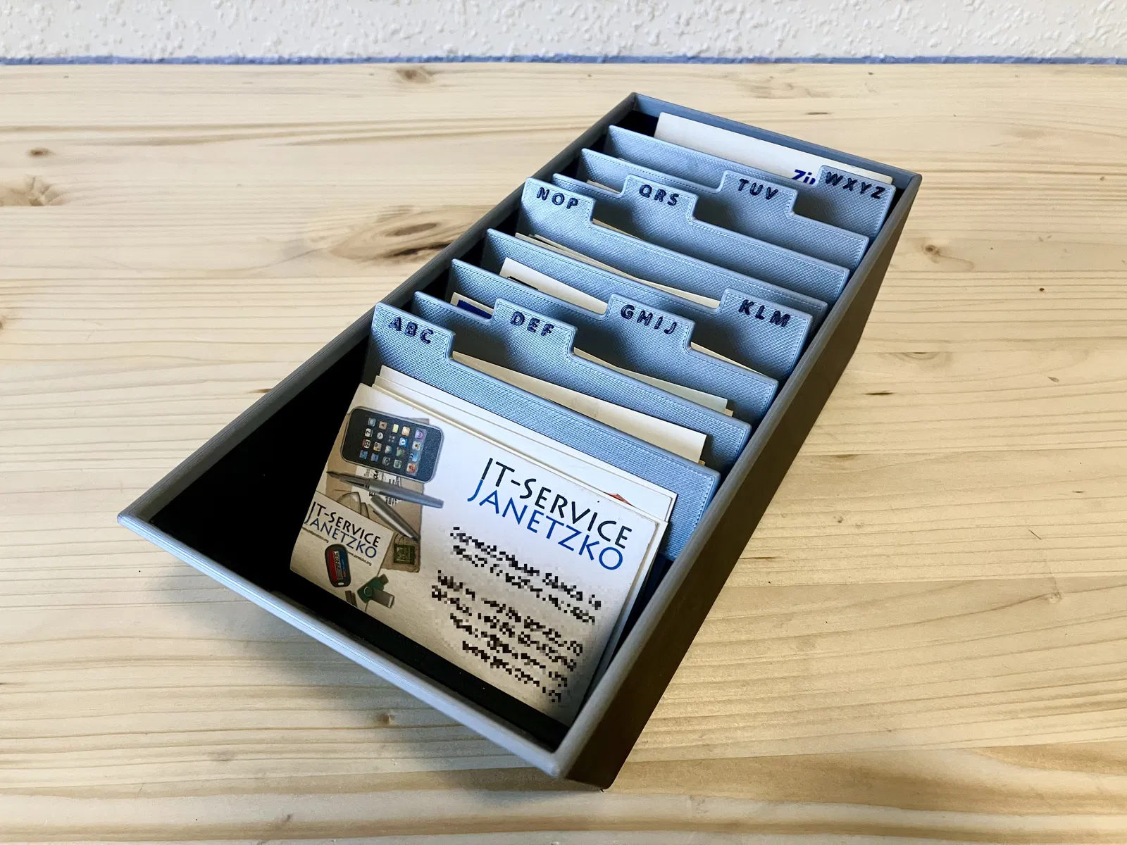 Visitenkartenhalter theo thiết kế CoolDesk: ngăn để danh thiếp của bạn luôn sẵn tay, kèm các khe register để sắp danh thiếp người khác theo alphabet. Có file .step và .stl, lắp ráp khít, có thể dán keo 502 để chắc hơn.