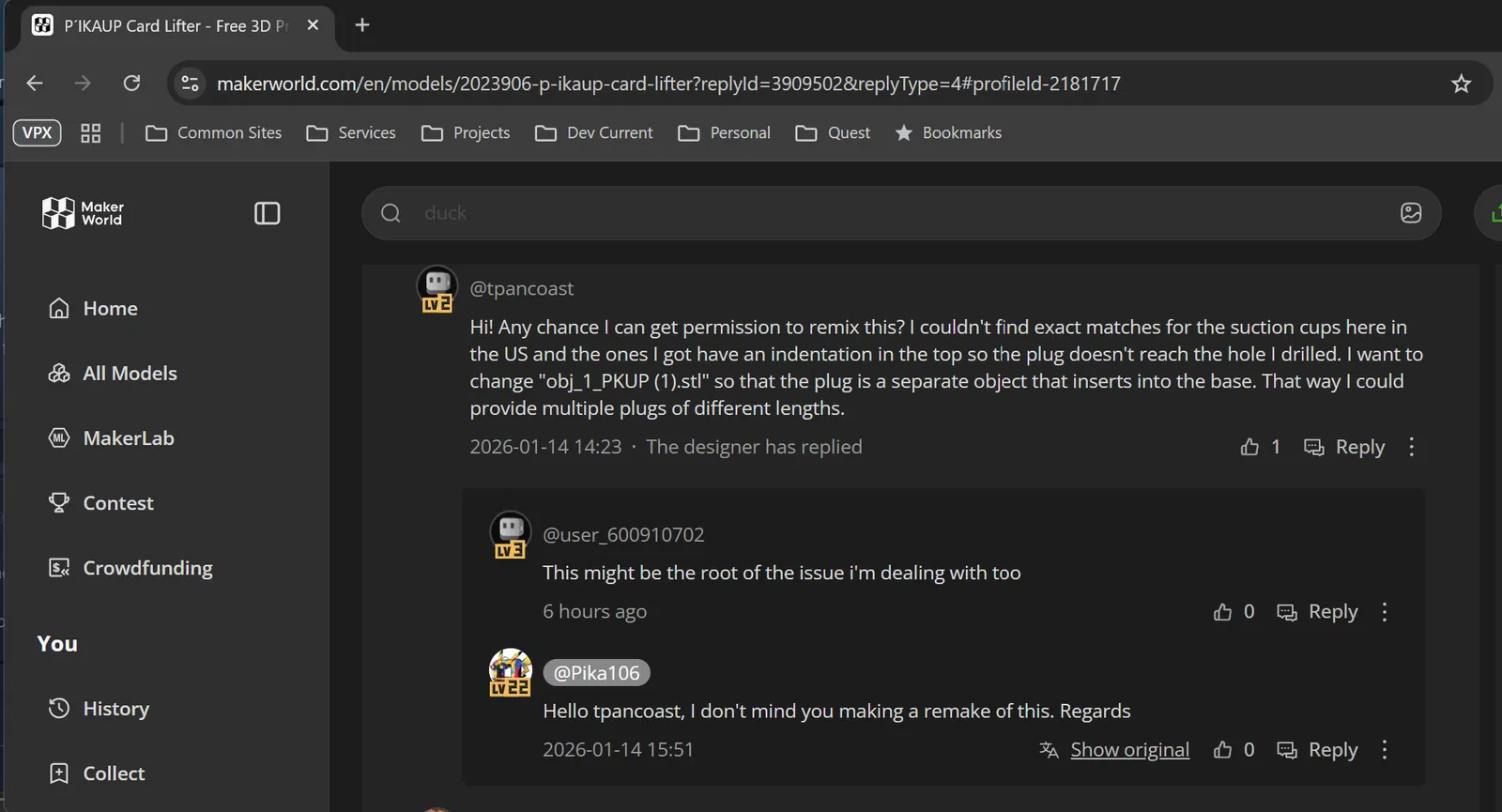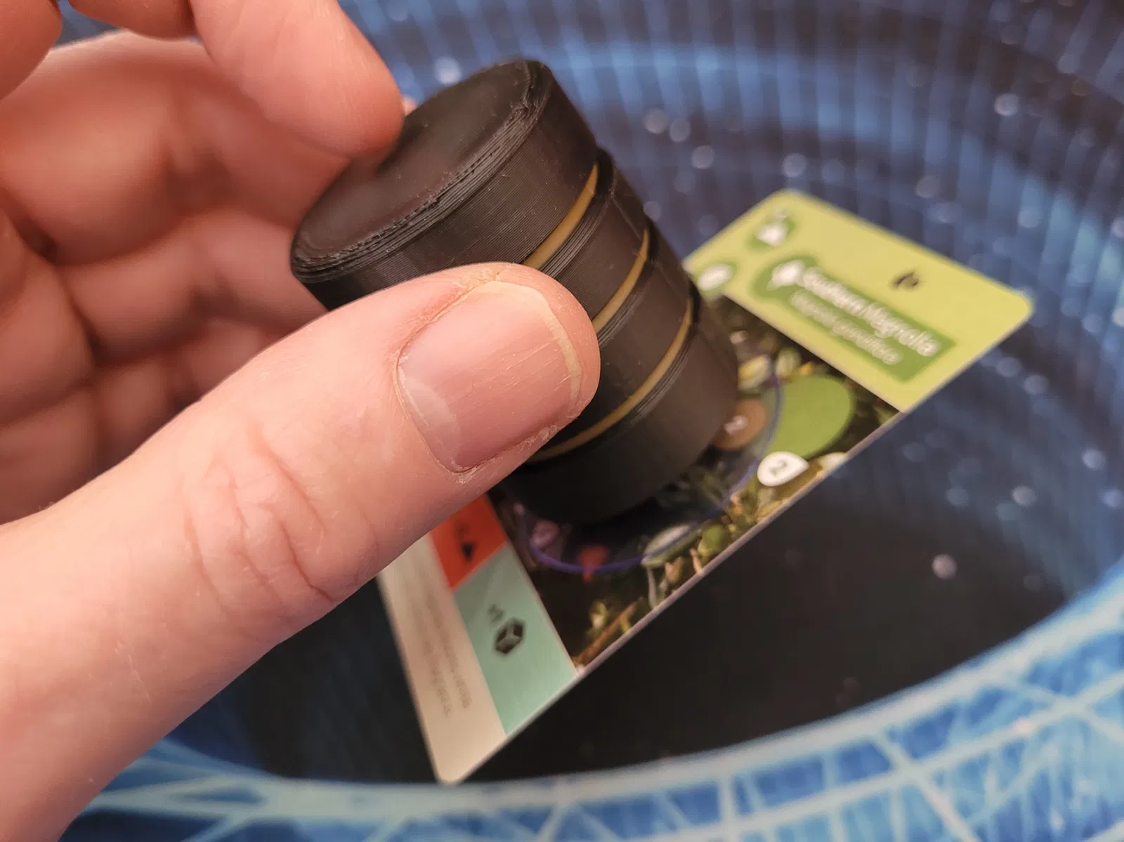 Trước hết, cảm ơn Pika106 vì thiết kế PIKAUP của anh ấy trên MakerWorld. Anh ấy tạo ra một mẫu giúp nhấc nhanh và dễ nhiều lá bài cùng lúc, rồi thả ra chỉ bằng cách bấm nút. Mình không mua được đúng loại suction cup như anh ấy gợi ý, và loại mình nhận được có phần lõm ở phía trên. Cái pin dùng để bịt lỗ đó lại thì không đủ dài.