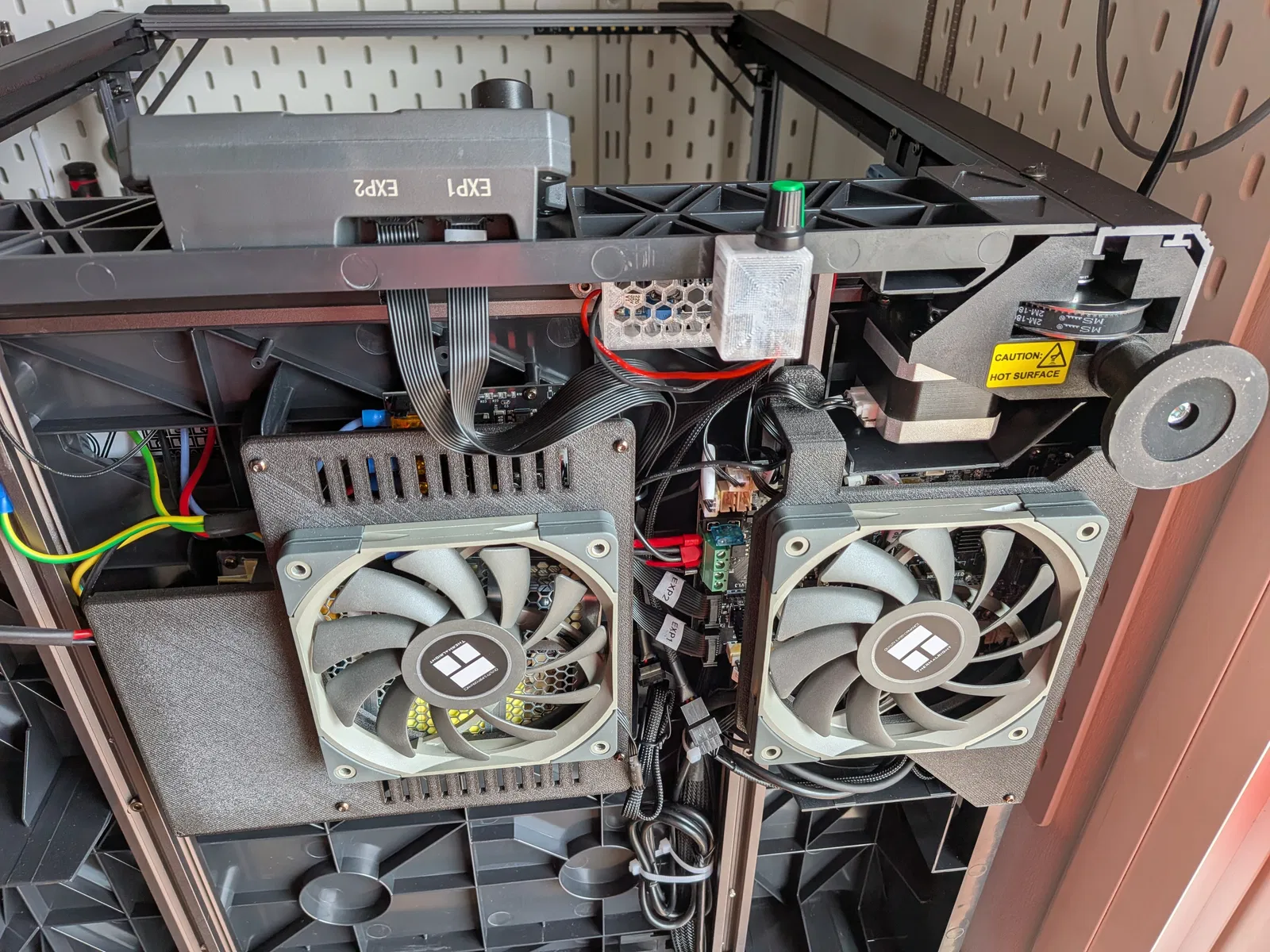 Thiết lập này dùng một bộ điều khiển duy nhất kèm dây chia Y để quản lý cùng lúc hai quạt 120mm: một cho PSU và một cho bo MCU.