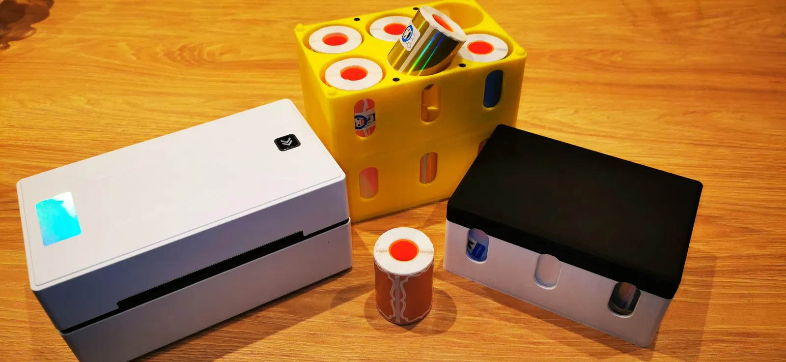 Mẫu Thermal printer label holder giúp lưu trữ và sắp xếp cuộn nhãn in nhiệt. Ngăn chứa cuộn tới ø50mm hoặc 50x50mm, có chốt canh tâm. Thiết kế xếp chồng, giữ bằng ma sát và hỗ trợ gắn nam châm ø5x1mm.