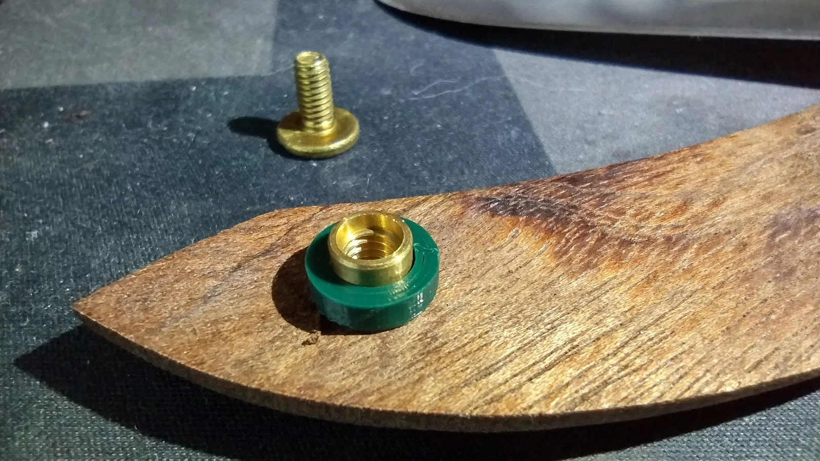 Miếng spacer này được thiết kế để vừa với các “rivets” dạng ốc trên Svord Peasant. Cái chốt không dùng làm bản lề lưỡi thì lại không có spacer, nên khi gập lại nó dễ trượt và kẹp vào lưỡi, làm thao tác mở/đóng khó hơn. Ngoài ra, lúc dao đóng lại thì lưỡi tựa trực tiếp lên chốt đồng (brass), khiến mép lưỡi bị mòn thêm ở đúng một điểm. Một spacer nhựa sẽ xử lý luôn cả hai vấn đề này.