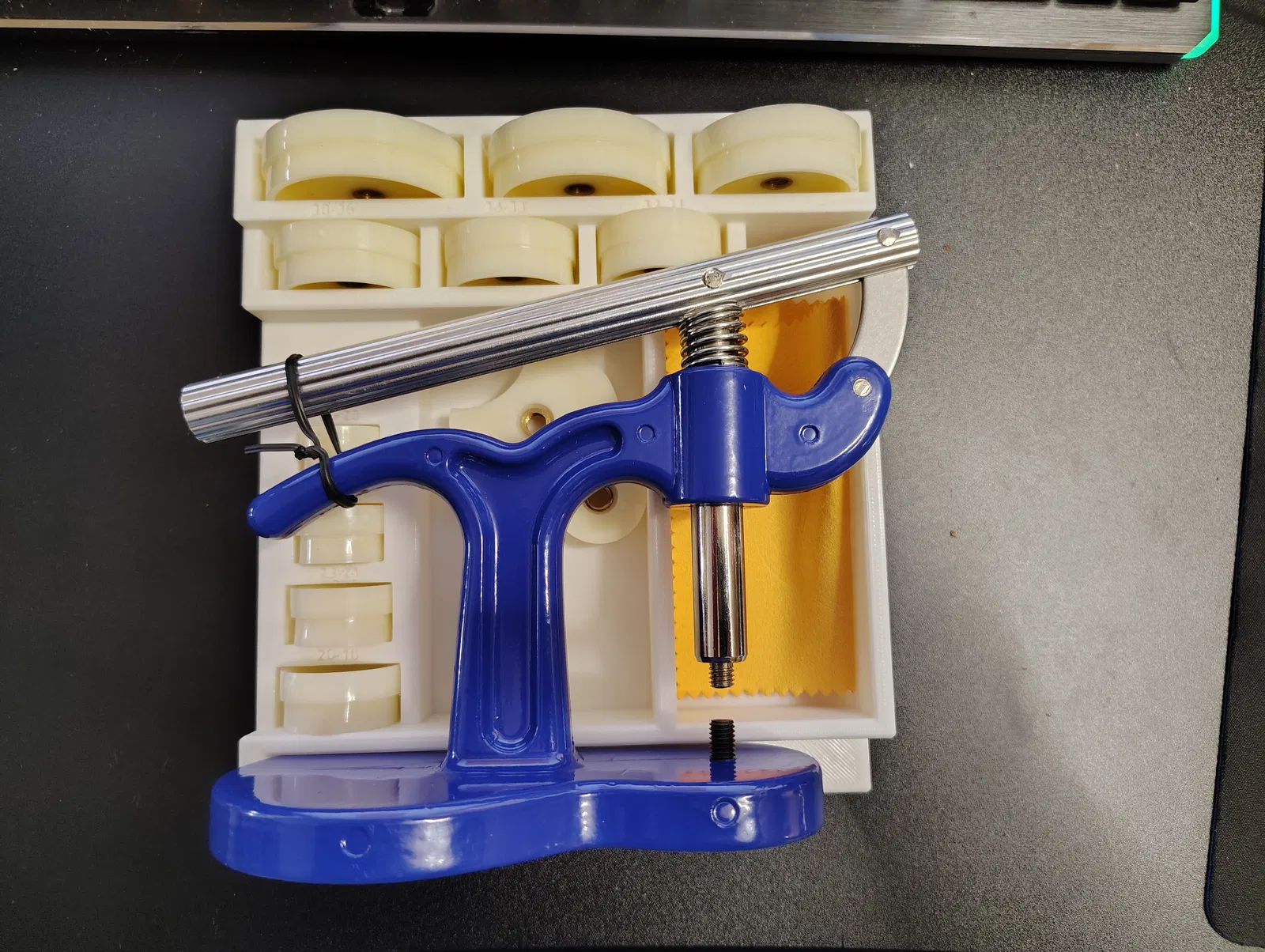 Giá đỡ giúp cố định watch back press kiểu cần gạt và sắp xếp gọn các dies đi kèm. Có thêm “mouse ears” để hạn chế warping khi in. Mẫu được in PLA trên Ender3 và dựng bằng OnShape.