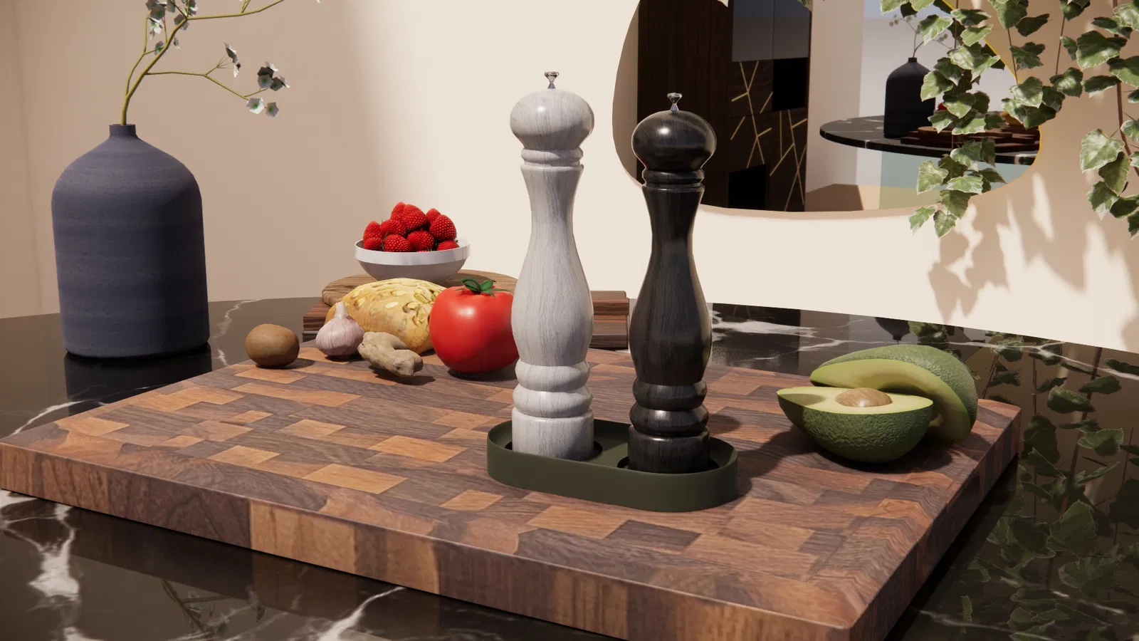 Khay đựng hũ xay muối và tiêu phong cách hiện đại, giúp hứng muối/tiêu rơi vãi sau khi xay để mặt bàn luôn gọn sạch. Fit grinder Ø55 mm, có thể scale X/Y, in không cần supports.