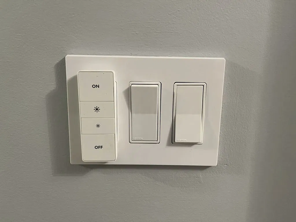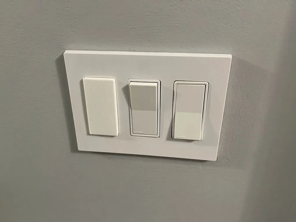 Một tấm bìa công tắc trống để dán Phillips Hue Dimmer vào tường, bên cạnh một công tắc Decora hiện có!