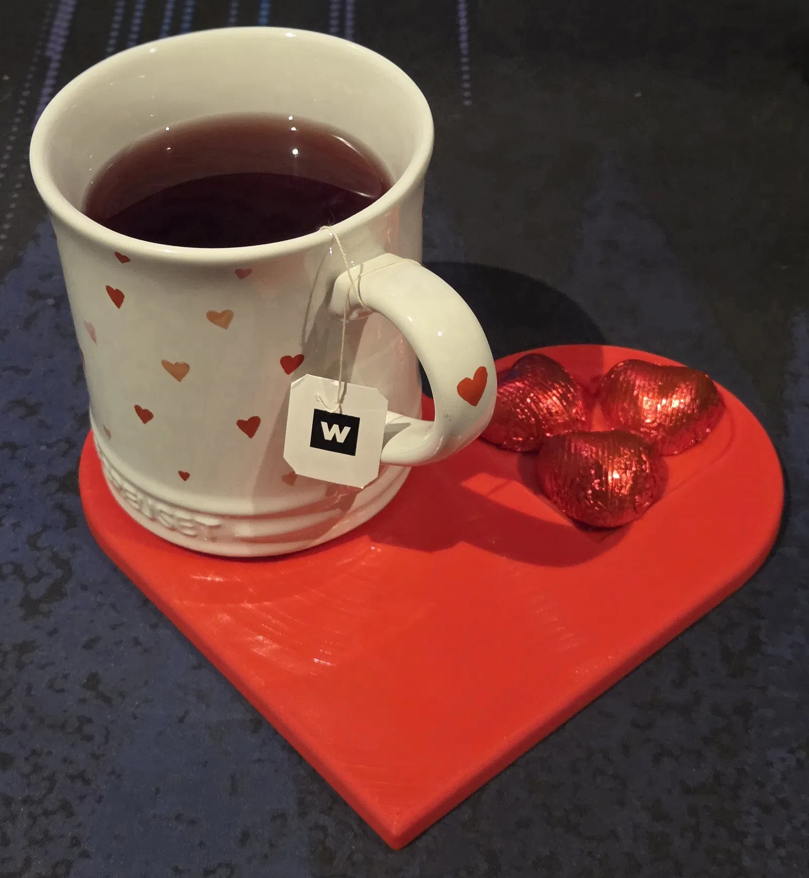 Miếng lót ly hình trái tim đa dụng cho Valentine: vừa đặt mug chống đọng vòng nước, vừa có khay lõm để chocolate, bánh quy hoặc túi trà. Thiết kế in phẳng, không cần supports, in nhanh gọn làm quà nhỏ xinh.