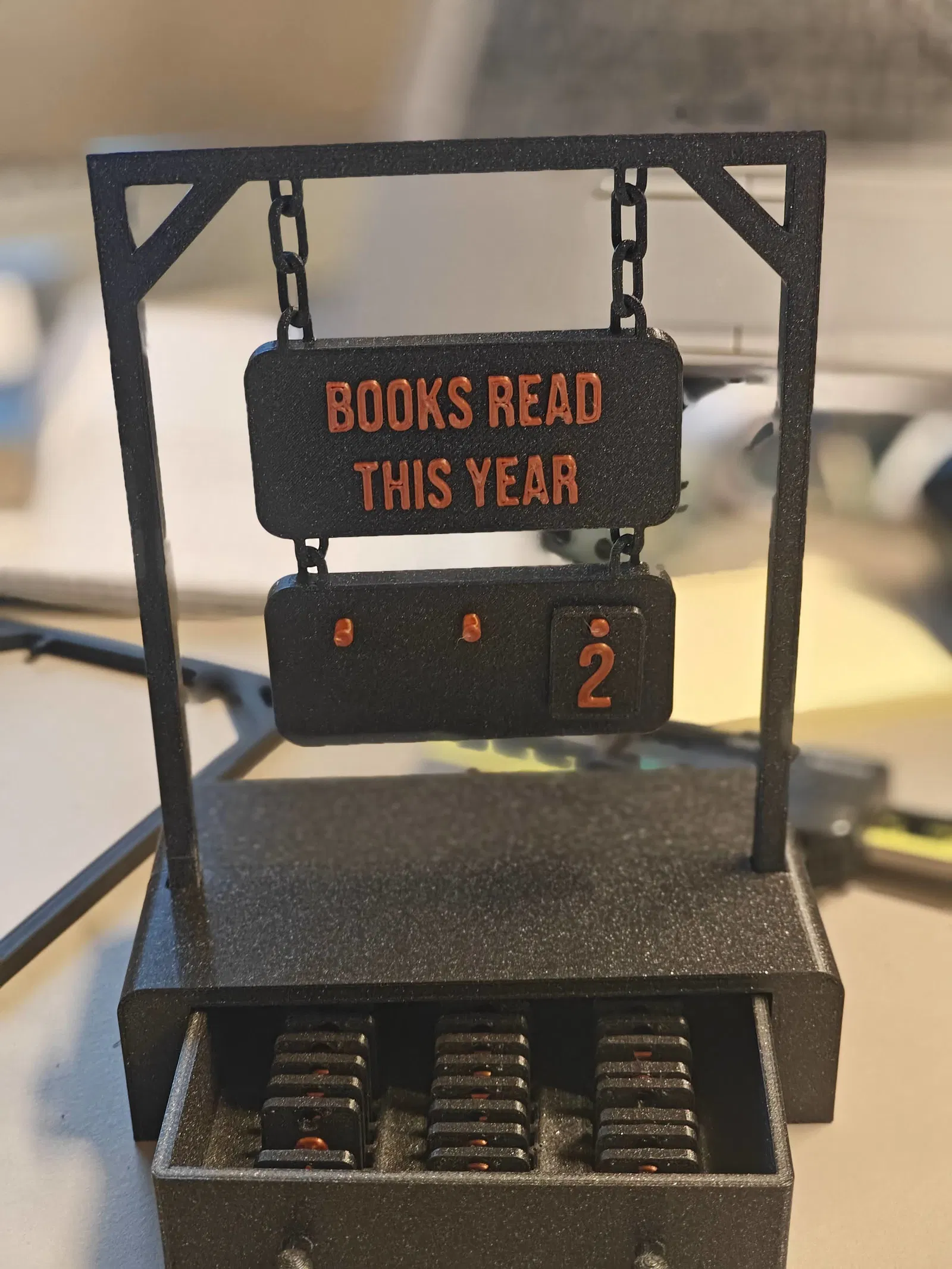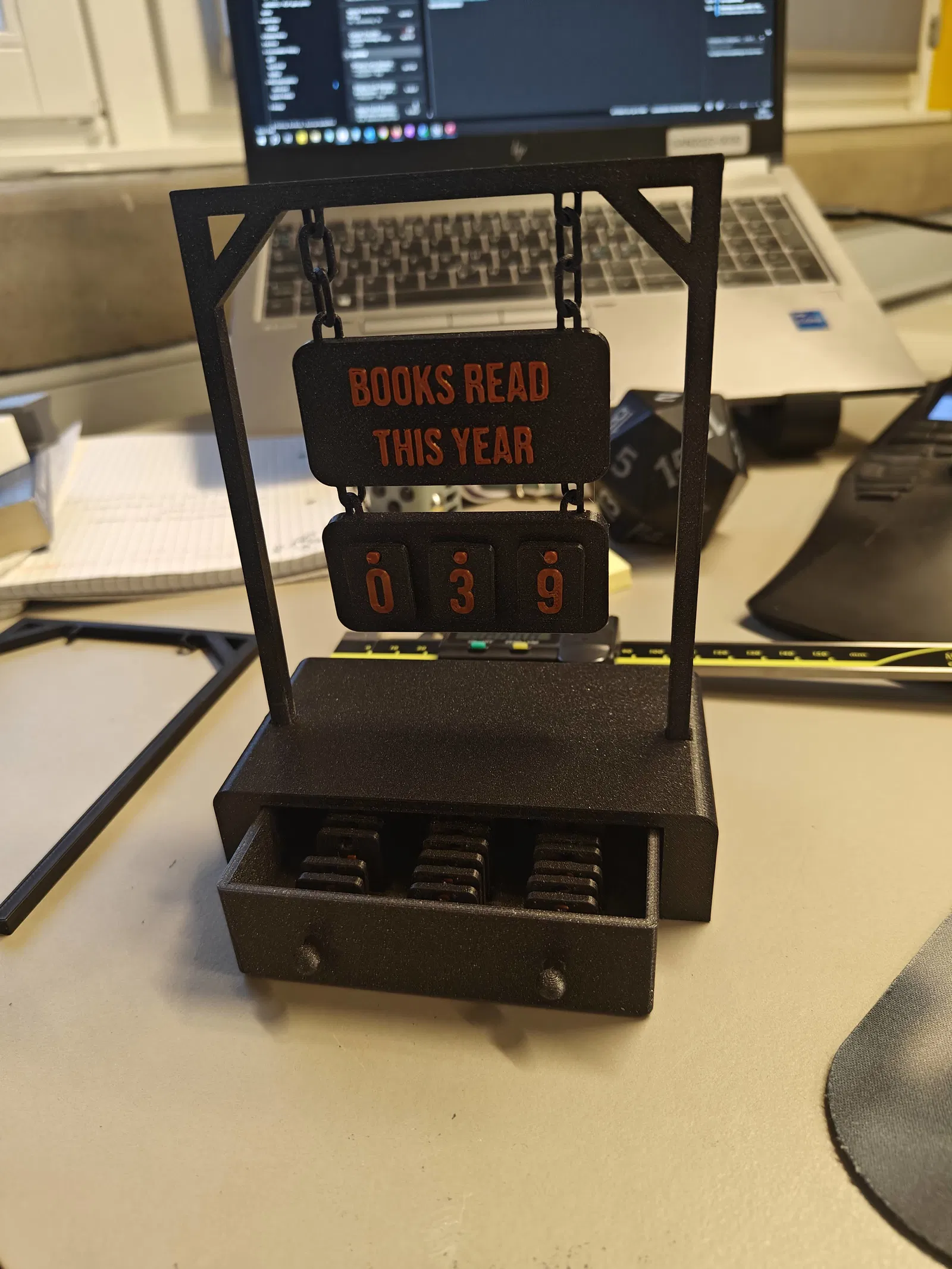 Mẫu bảng treo giúp bạn theo dõi số sách đã đọc trong năm. Ngăn kéo chứa 30 bảng số 0–9 cho mỗi peg; khung in được không cần supports, còn phần chains nếu khó in thì thêm brim để giữ link ổn định.