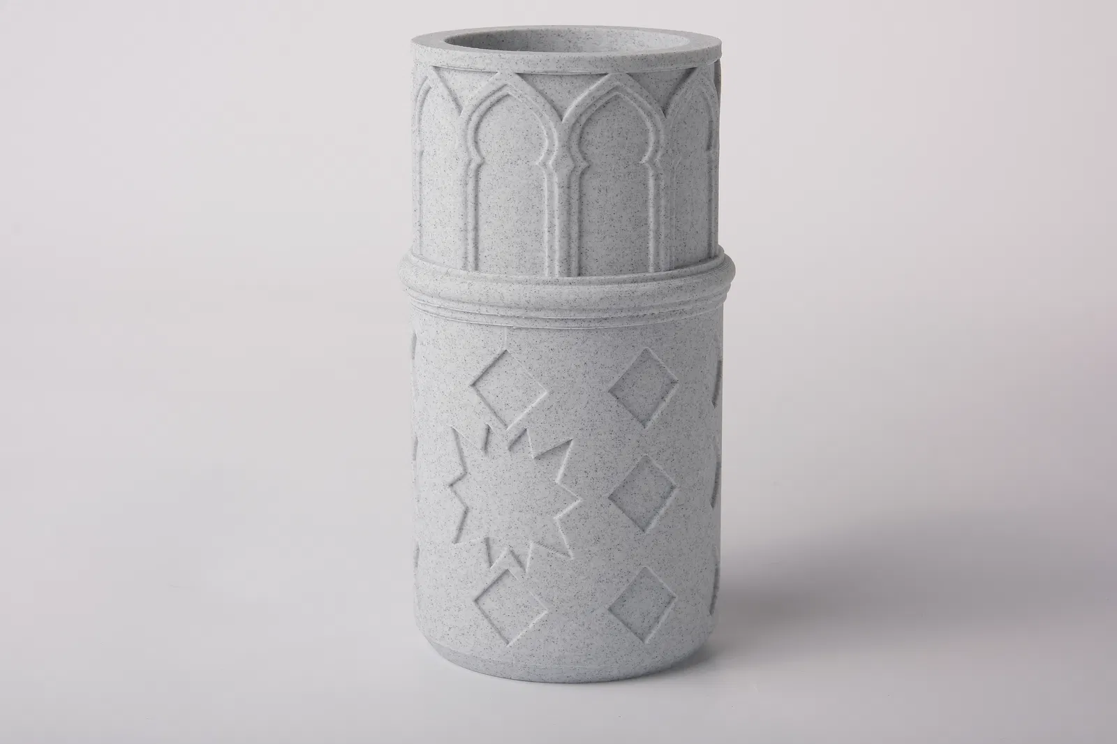Bình hoa kiến trúc lấy cảm hứng từ hoa văn lưới Moroccan và mashrabiya, nổi khối hình học và trang trí xếp lớp. Dùng làm decor, chậu cây hoặc điểm nhấn nội thất; hợp phong cách hiện đại, boho, Địa Trung Hải.