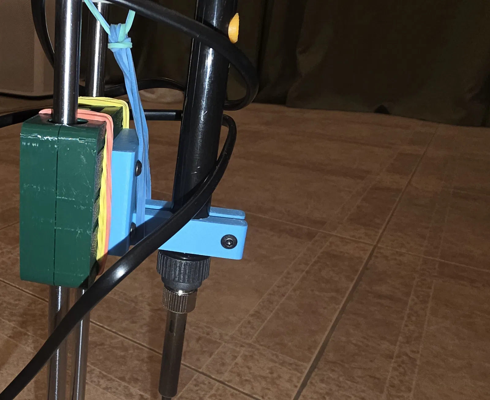 Kẹp đa năng (Universal clamp) dùng cho nhiều loại mỏ hàn, siết chắc bằng vít + đai ốc M3 dài 20mm. Phần kẹp gắn lên carriage bằng 4 vít M3, giúp cố định ổn định khi thao tác.