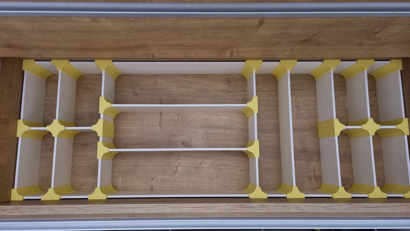 Bộ chi tiết in 3D giúp tạo vách ngăn ngăn kéo với ô chia linh hoạt. Hỗ trợ vách cao 6/10/14 cm, gồm nhiều kiểu connector để nối tấm PVC/plywood 5mm. In không cần support, nozzle 0.4, layer 0.2.