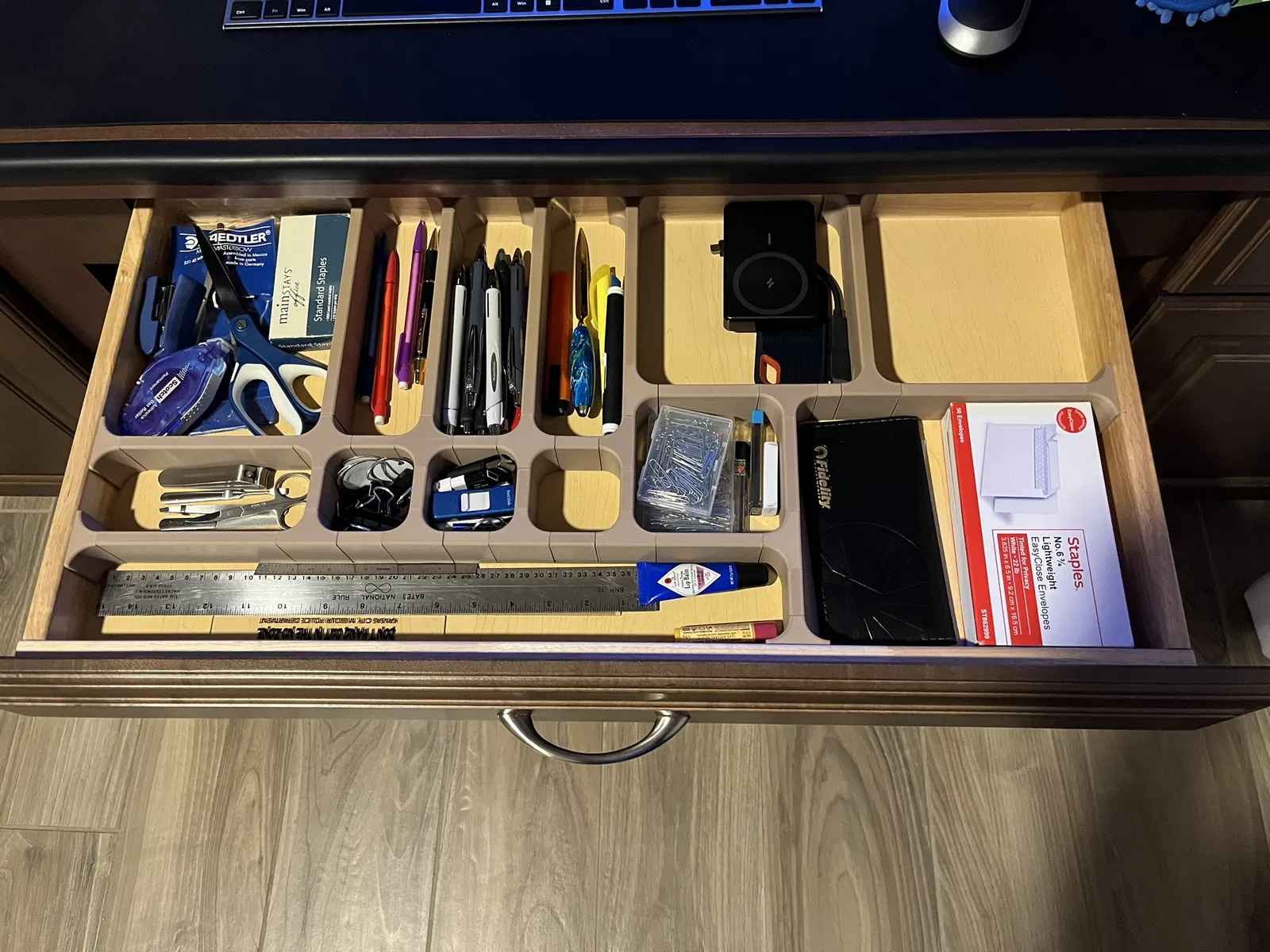 Bản remix biến drawer organizer modular thành hệ liền mạch bằng panel in 3D có tab trượt vào rãnh sẵn. Không cần tự cắt gỗ/acrylic, mép trên bo tròn nhìn hoàn thiện. Gợi ý vật liệu PLA/PLA+, wood‑filled PLA và tinh chỉnh scale X/Y để vừa khít.