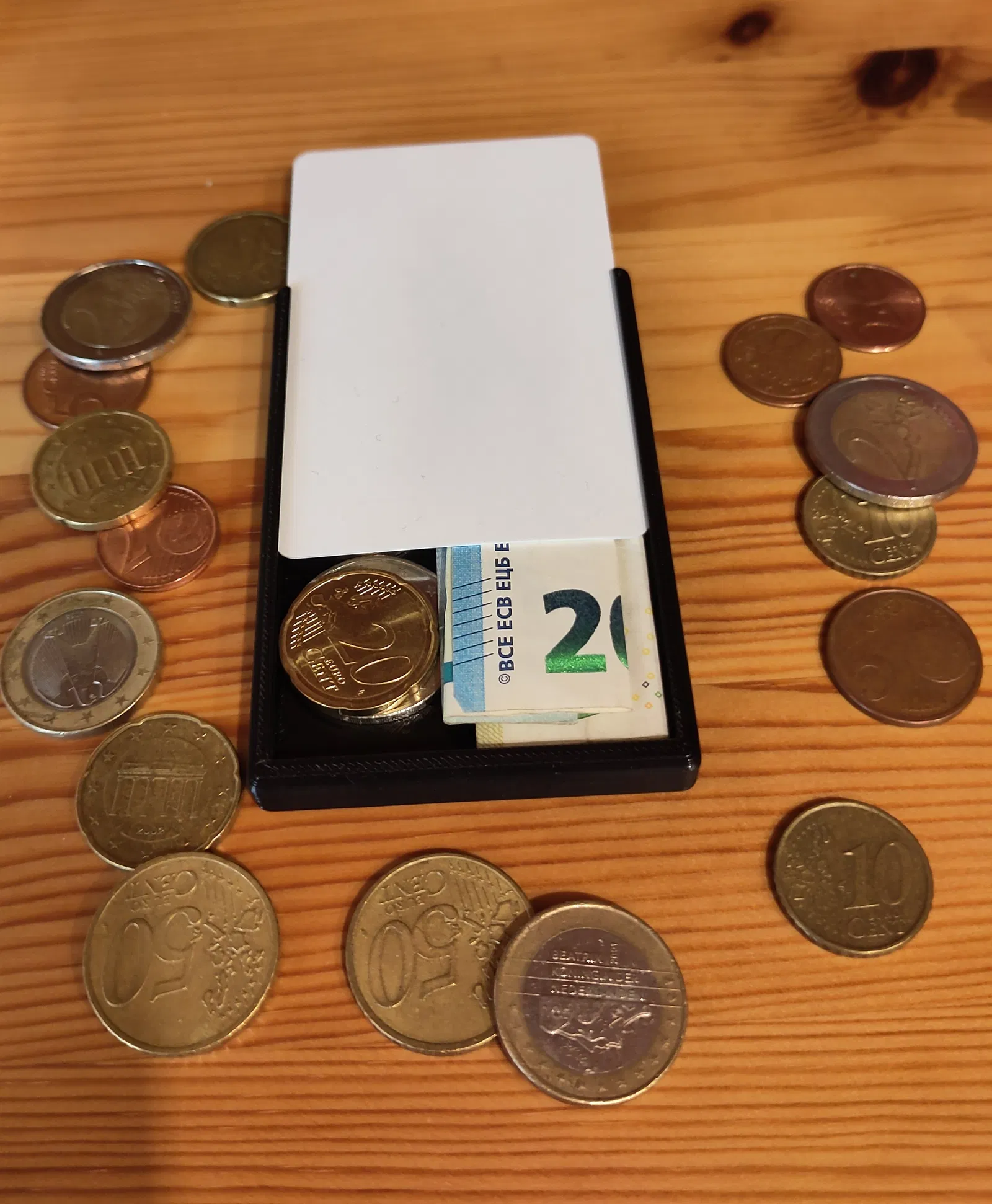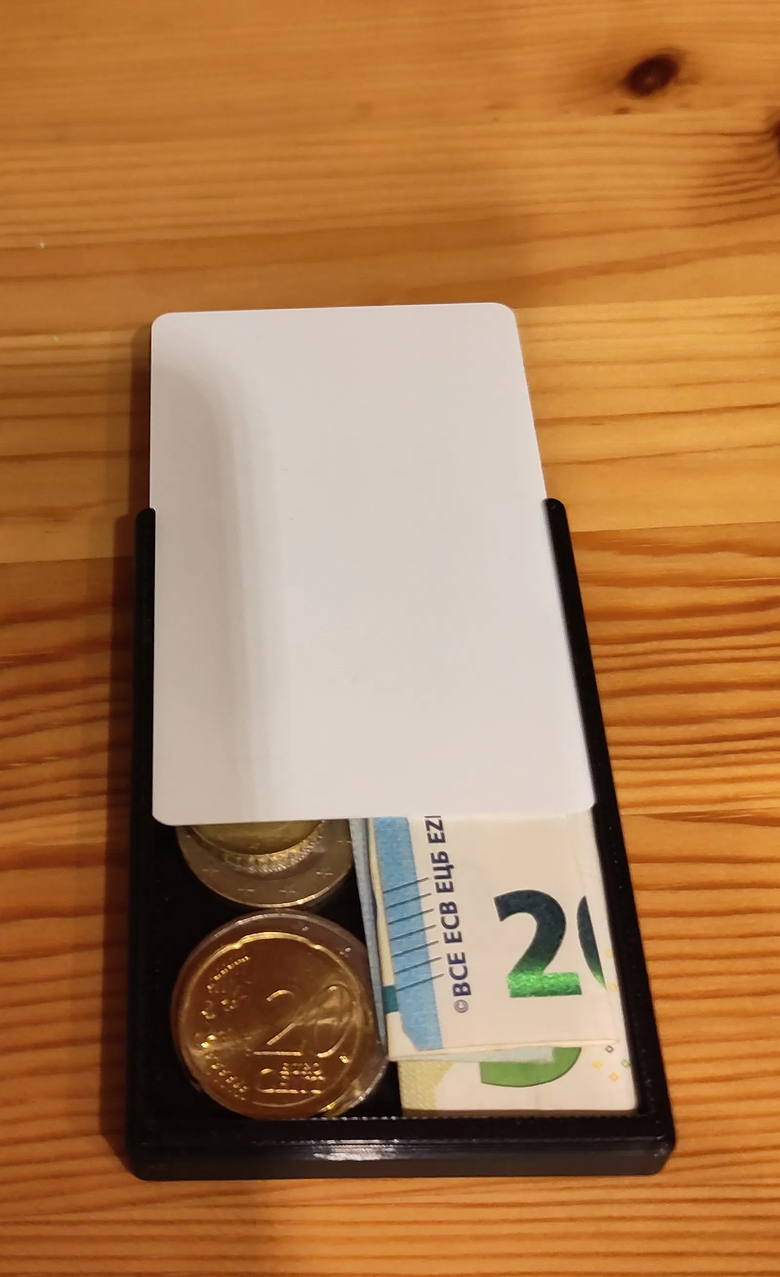 Smart Wallet in PETG, dùng một tấm thẻ để khóa/giữ tiền bên trong và có thể để thêm thẻ ID. Thiết kế đã được tối ưu nhiều lần và gần như không cần supports (chỉ ở phần đáy) khi in.