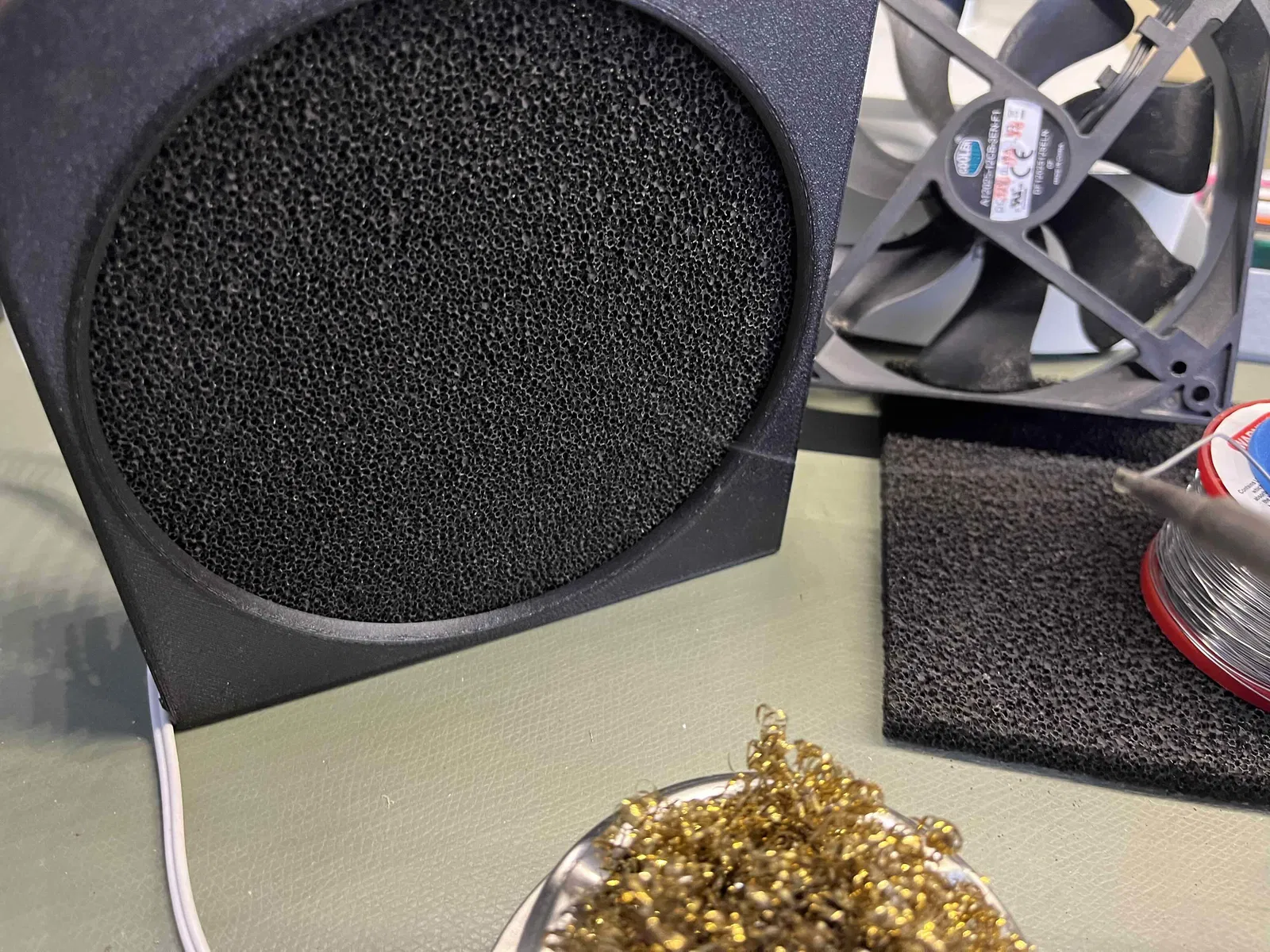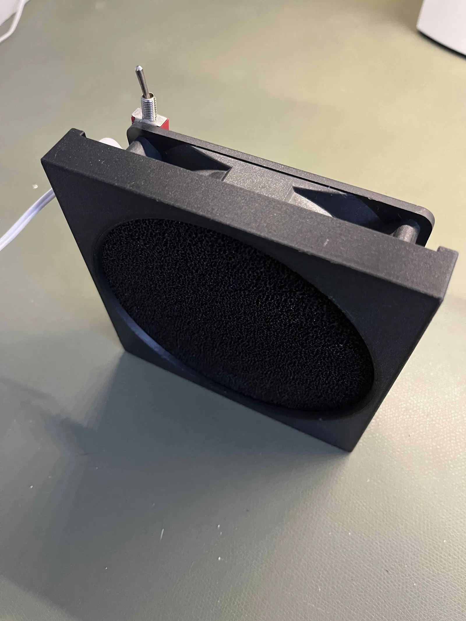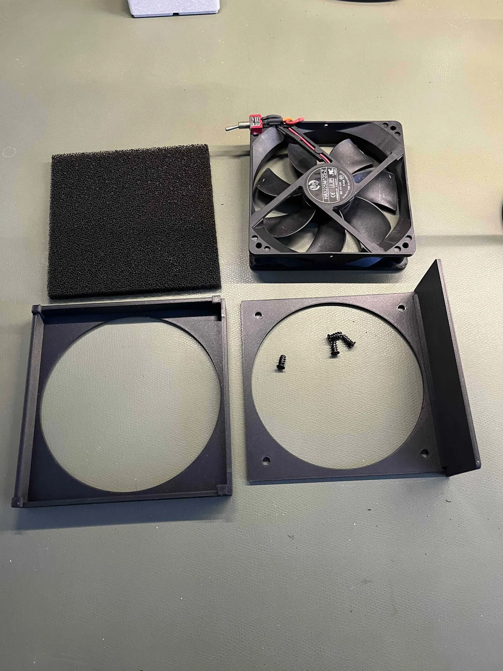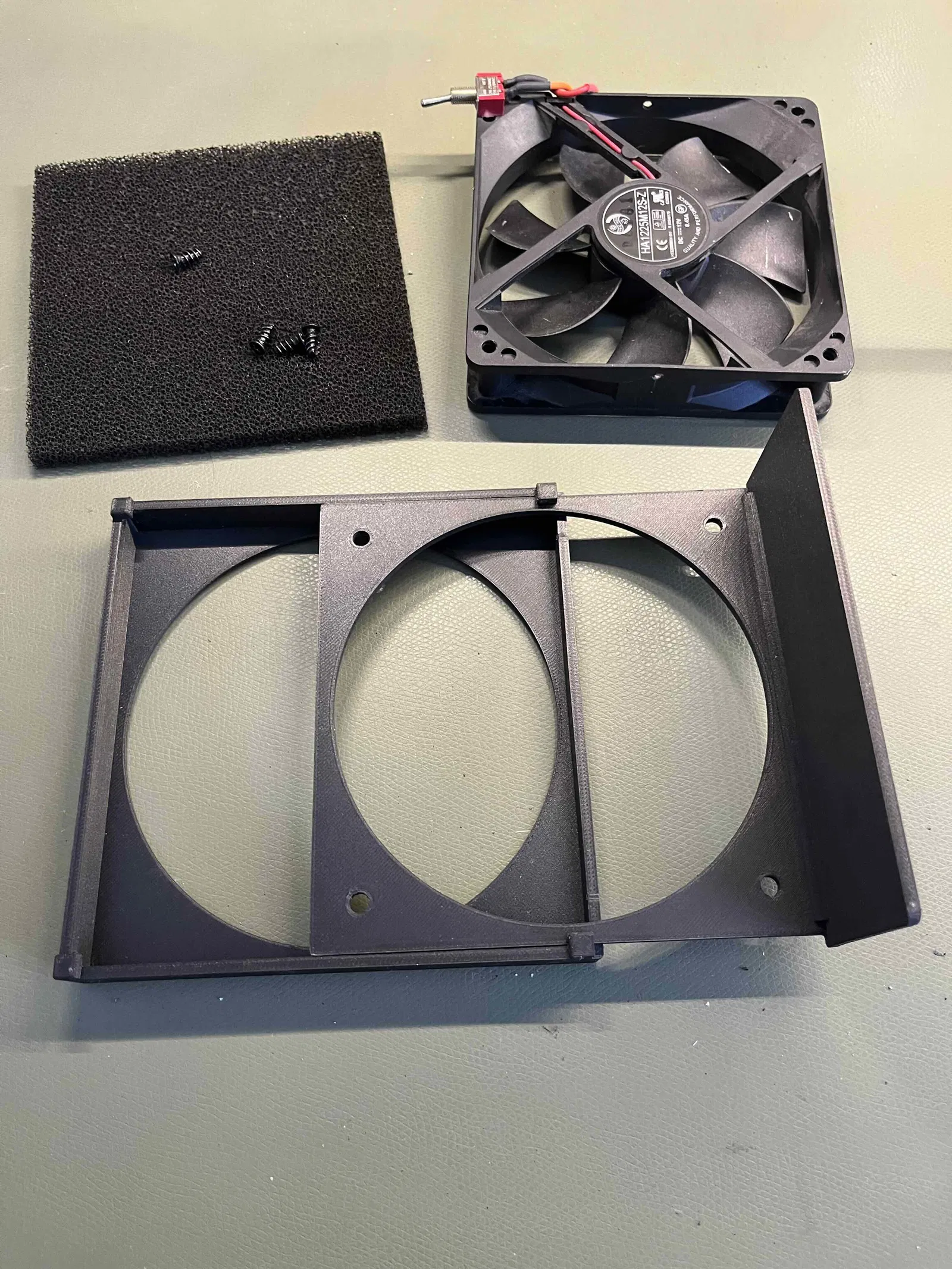 Dùng cho quạt 120 mm và lọc than hoạt tính dày 10 mm. Phần lọc tạo áp lực để giữ chặt hai phần lại với nhau. In bằng PETG Carbon.