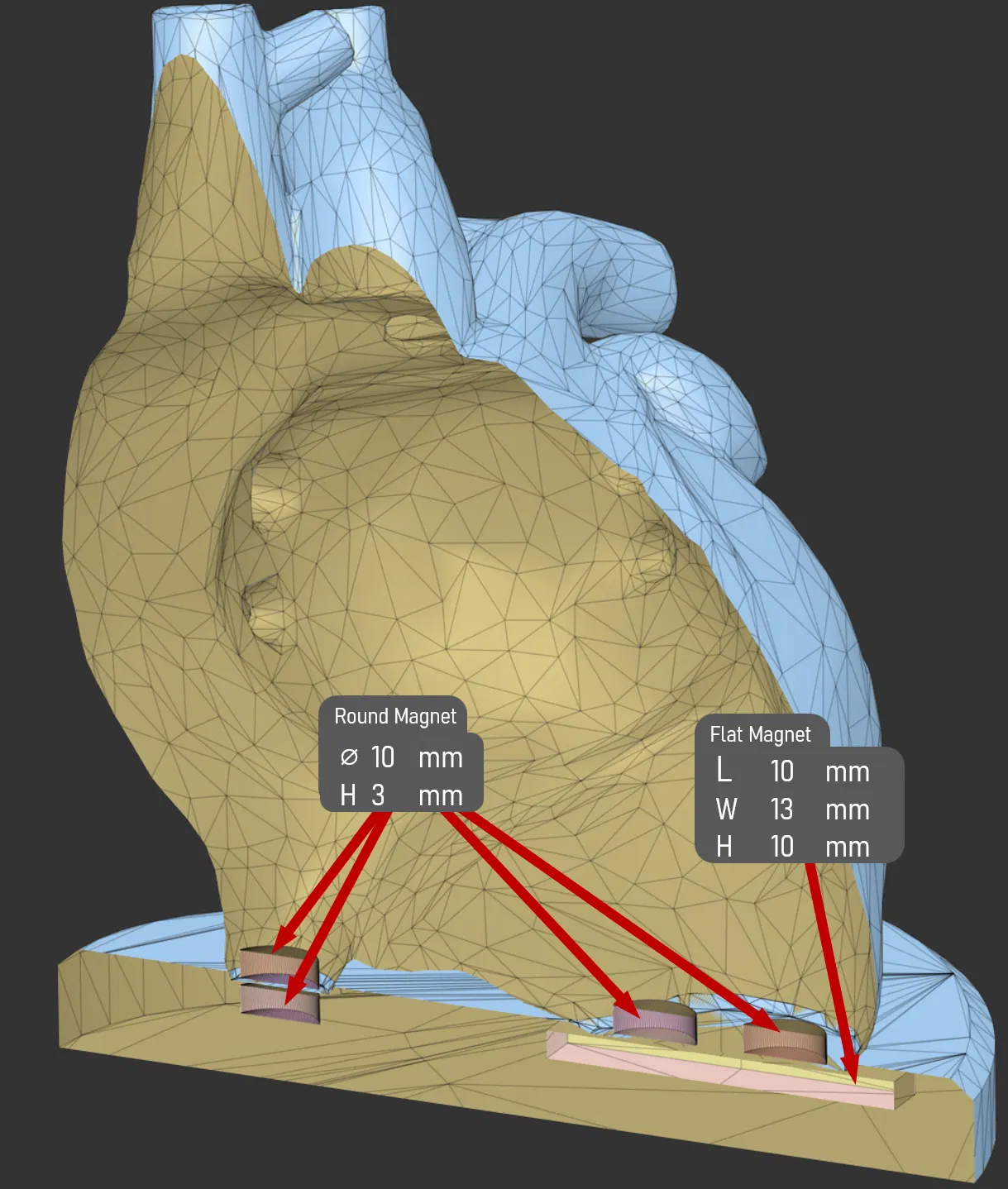 Nam châm được gắn trực tiếp vào cả hai phần ngay trong lúc in. Nhờ vậy hai nửa tim canh khớp chuẩn và hít chặt vào nhau, không cần dùng keo hay hậu xử lý.
