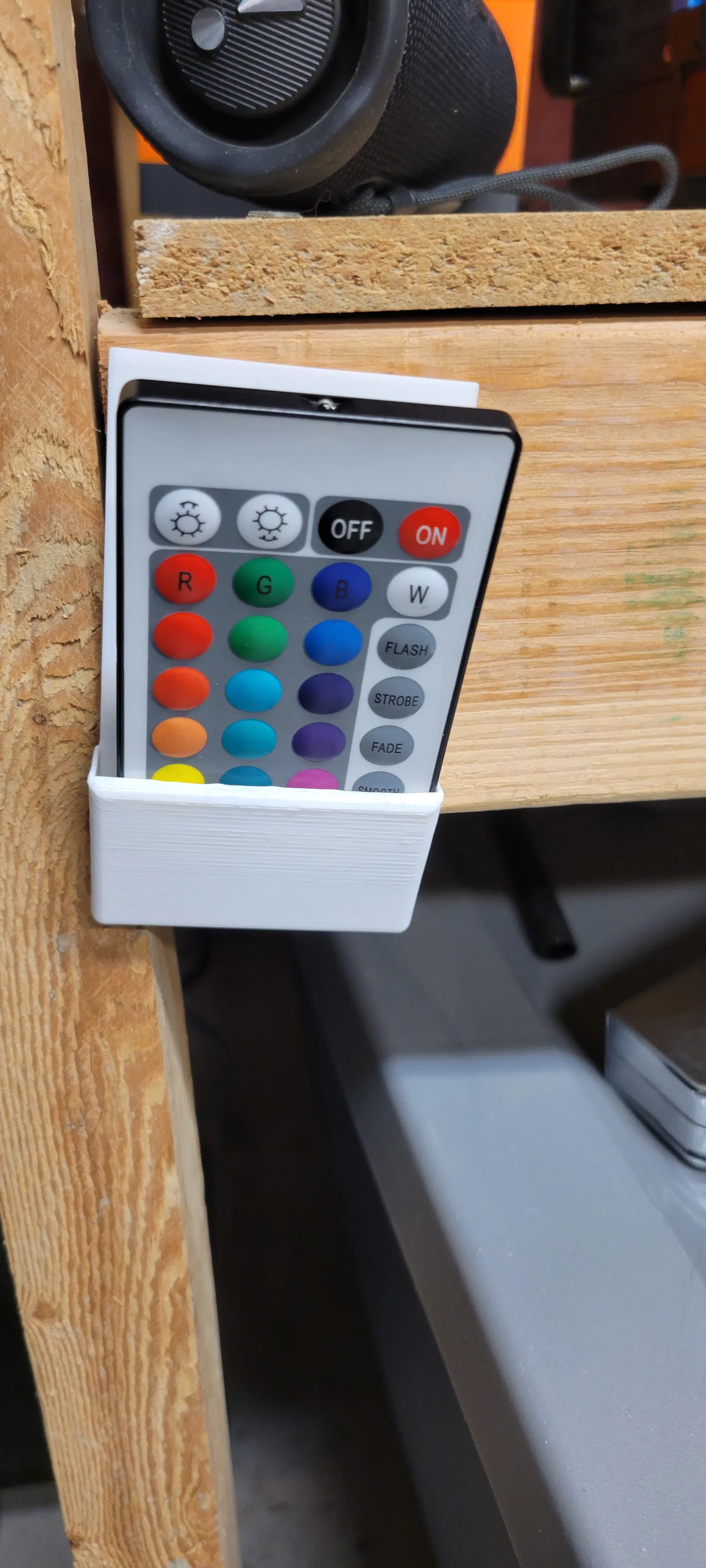 Mẫu giá đỡ gắn tường đơn giản để treo/giữ remote đèn LED strip. Thiết lập in gợi ý: không cần support, cao 20mm, infill 15%, Perimeter/Shell 2 lớp, phù hợp in nhanh và chắc chắn.