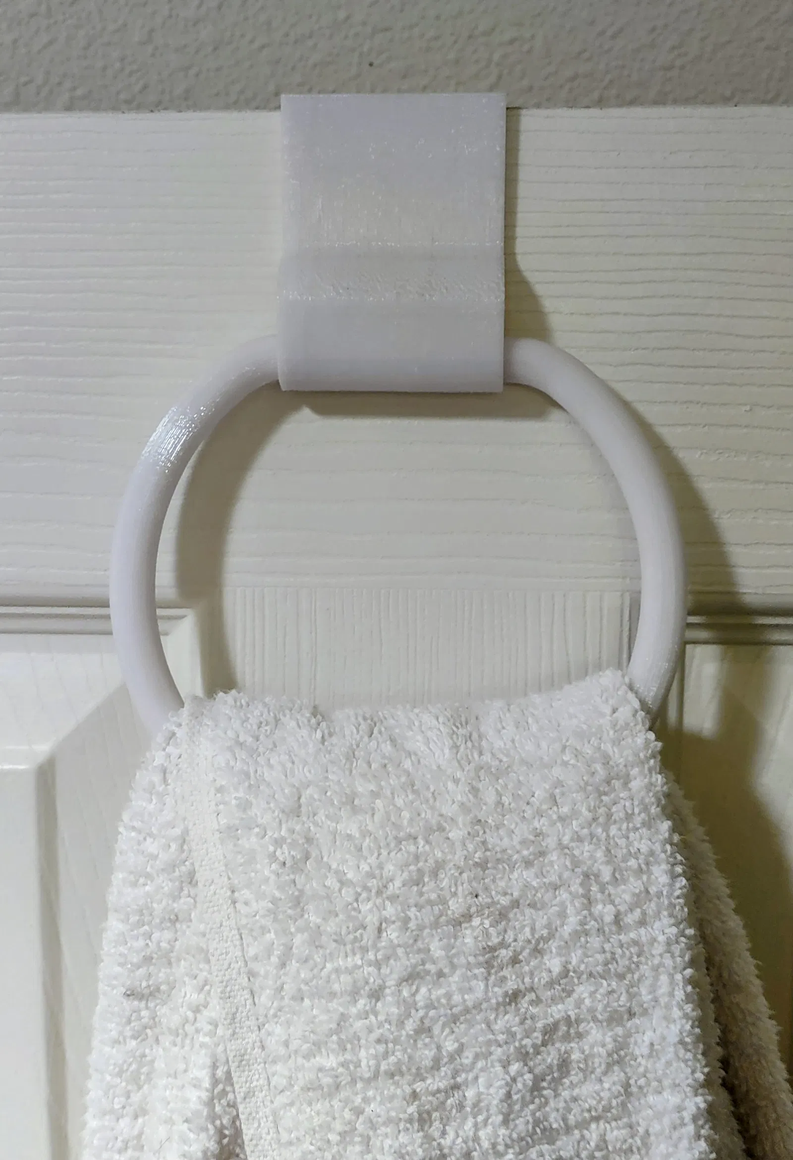 Vòng treo khăn qua cửa dạng low-profile, dễ in và dễ dời vị trí, đủ bền để dùng hằng ngày. Thiết kế cho cửa chuẩn dày khoảng 35 mm (1-3/8"). Gồm 2 phần: ring và hook, lắp nhanh.