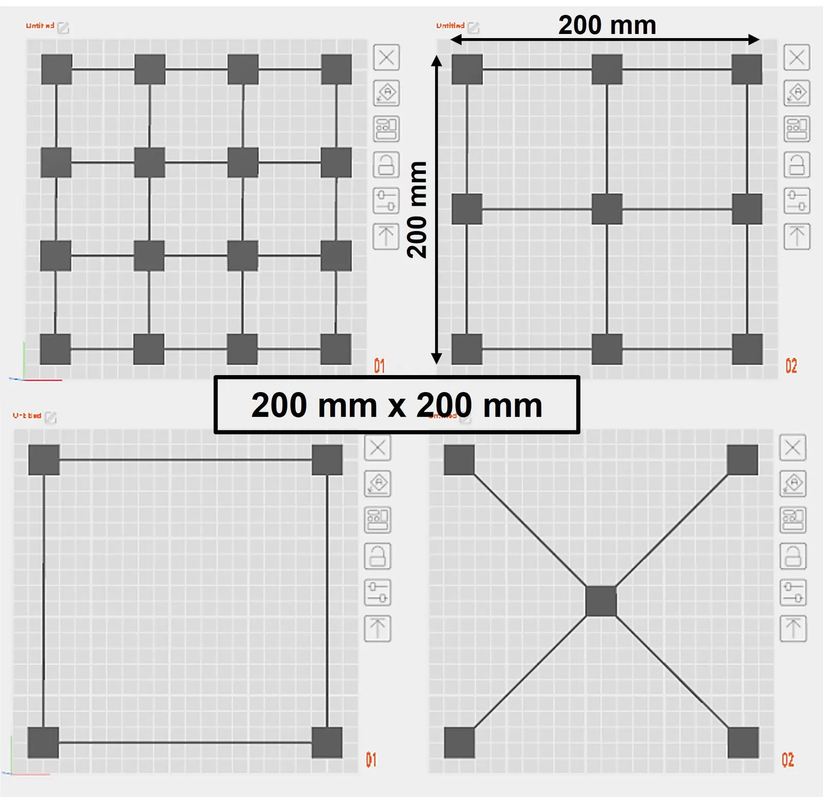 Bộ 4 file lưới bed leveling để canh first layer cho bàn in > 200mm x 200mm, gồm các tùy chọn 4x4, 3x3, 2x2 và 4+1. Có kèm link tham khảo thêm size 240x240 và 290x290.