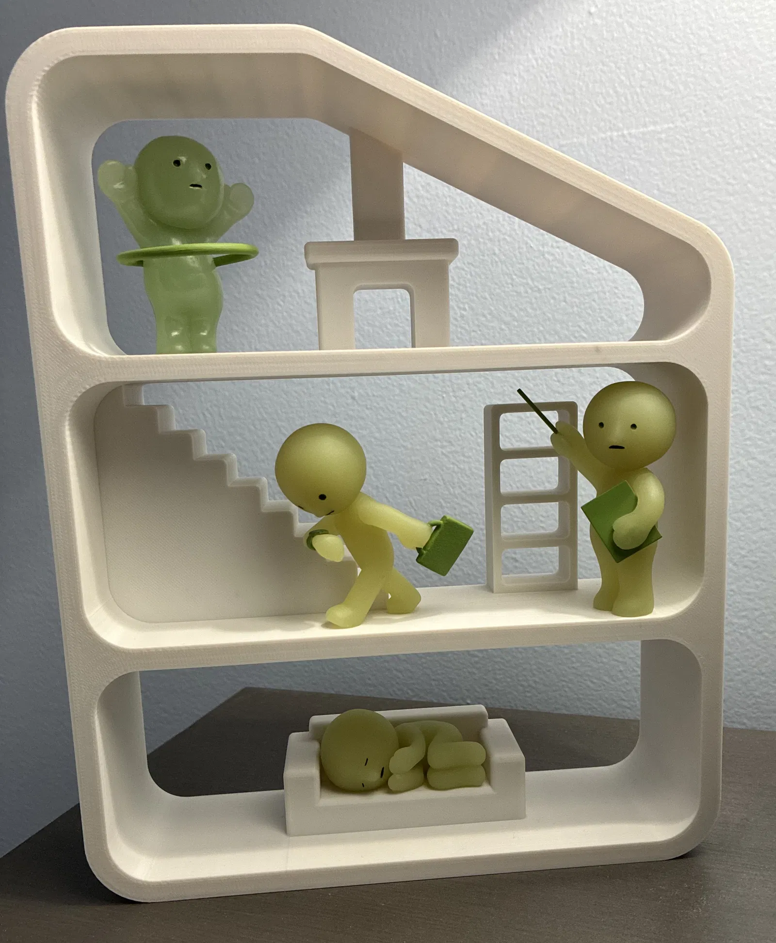 Mẫu nhà Smiski để trưng bày các bé Smiski. Tác giả in bằng PLA trắng với thiết lập eSun PLA mặc định, layer 0.10 trong PrusaSlicer; cần xoay model 90° để vừa khổ in trên MK4.