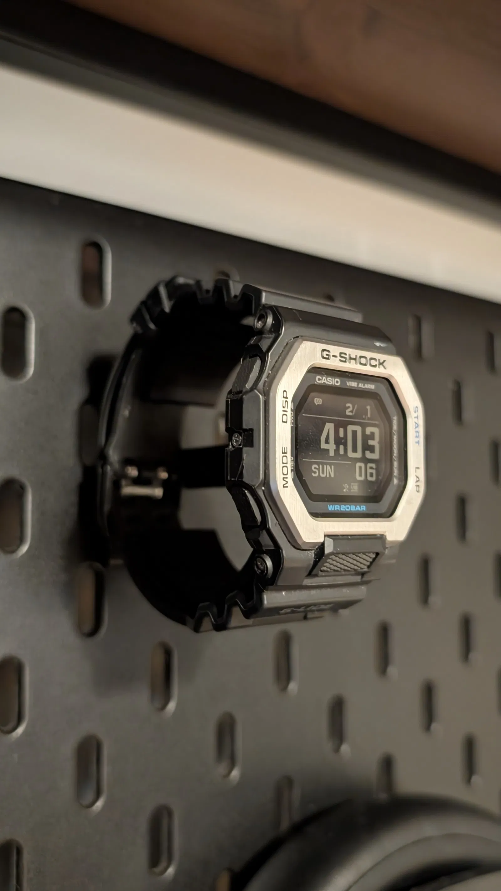 Bản remix IKEA SKADIS Watch Holder với mount rộng hơn, móc siết chặt hơn và thêm tấm đỡ tựa vào board. Giảm lắc đáng kể, bám chắc khi lấy/đặt đồng hồ hằng ngày mà không bị tuột rơi.