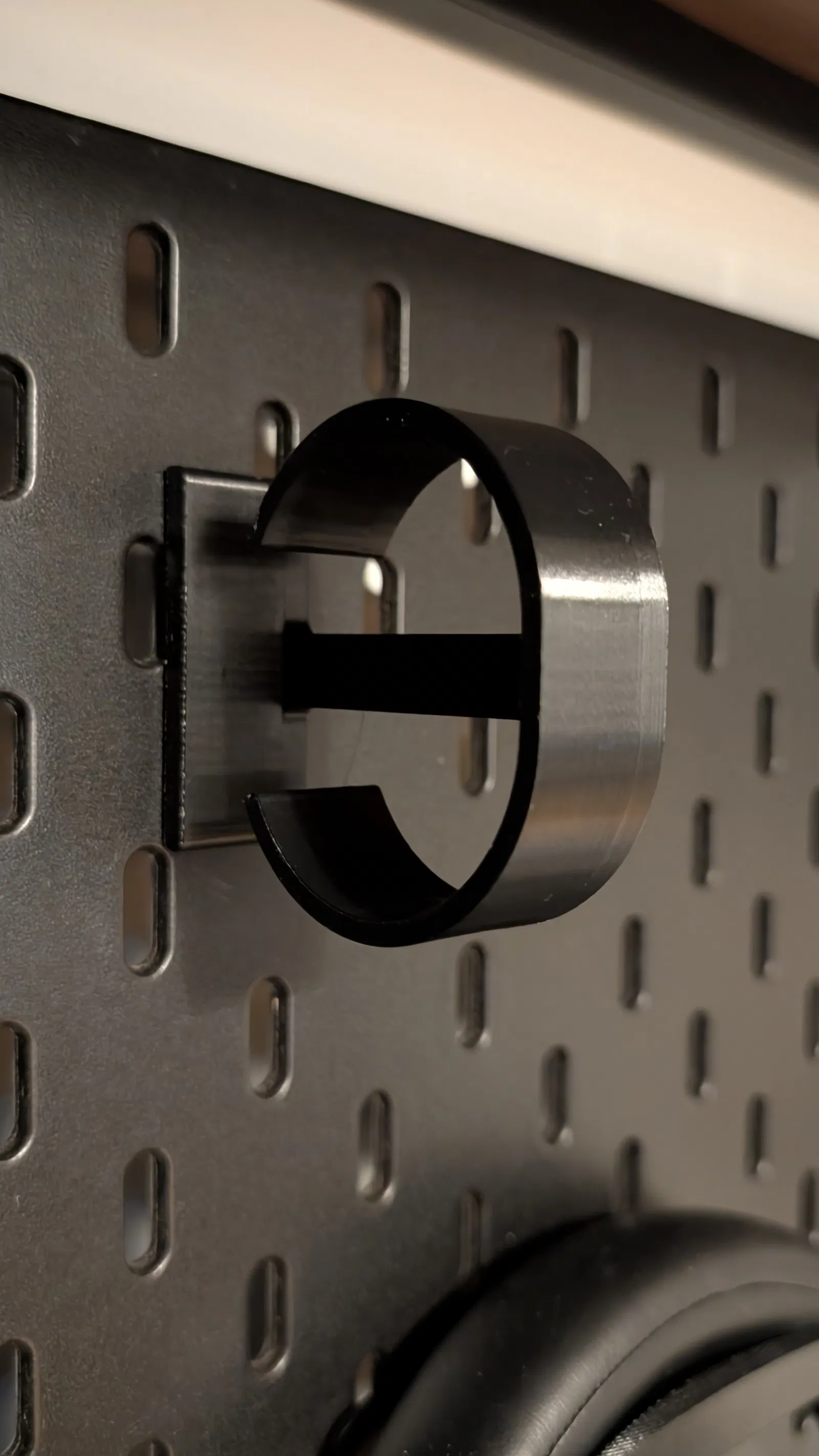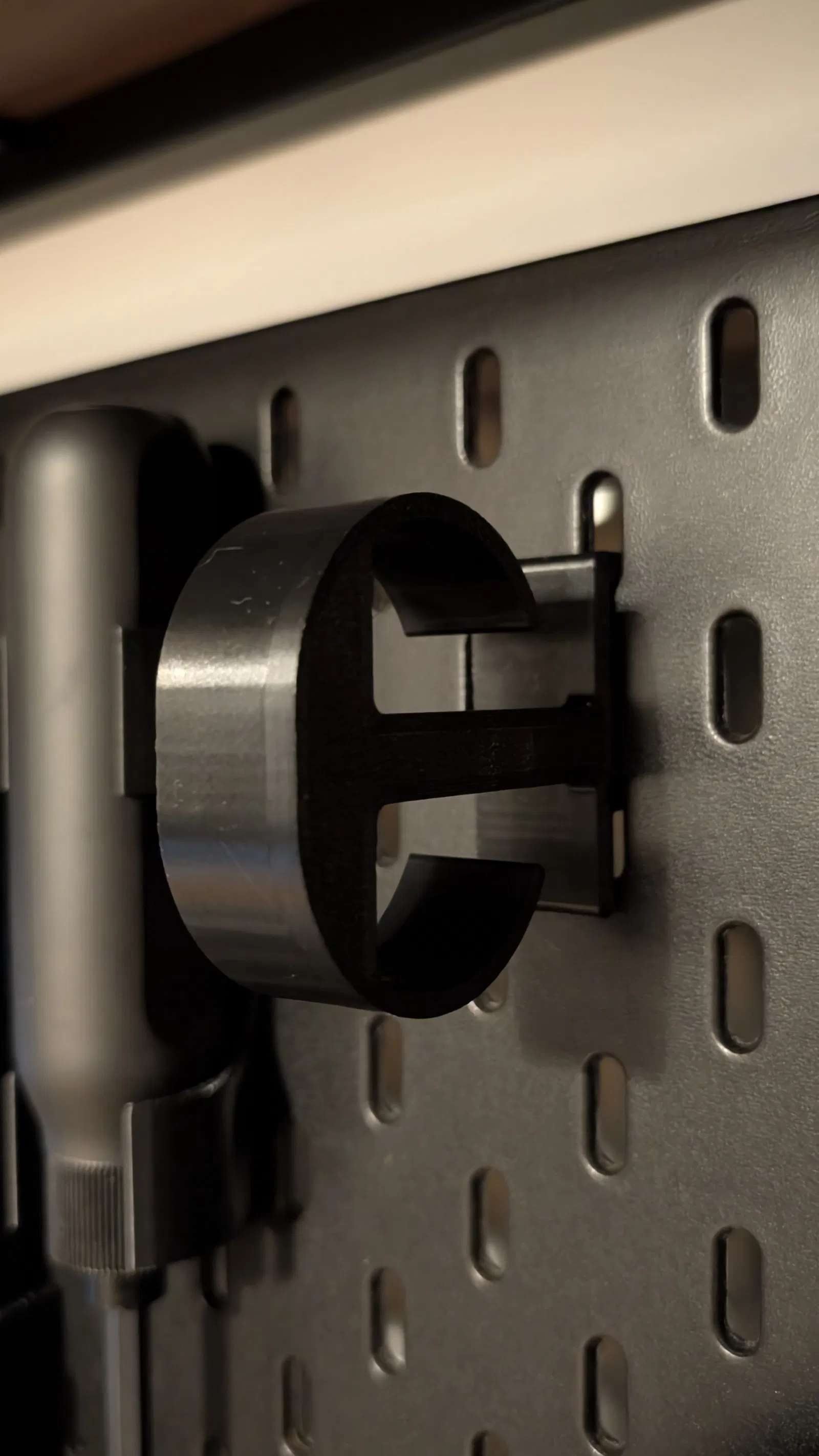 Khi gắn holder lên SKADIS board, bạn bắt đầu bằng cách móc phần móc trên vào trước, rồi ấn xuống với một chút lực; sau đó nó sẽ “snap” vào đúng vị trí chỉ bằng một động tác mượt. Bản này ôm khít hơn thiết kế gốc khá nhiều, nên lúc lắp cũng sẽ cần lực hơn một chút.