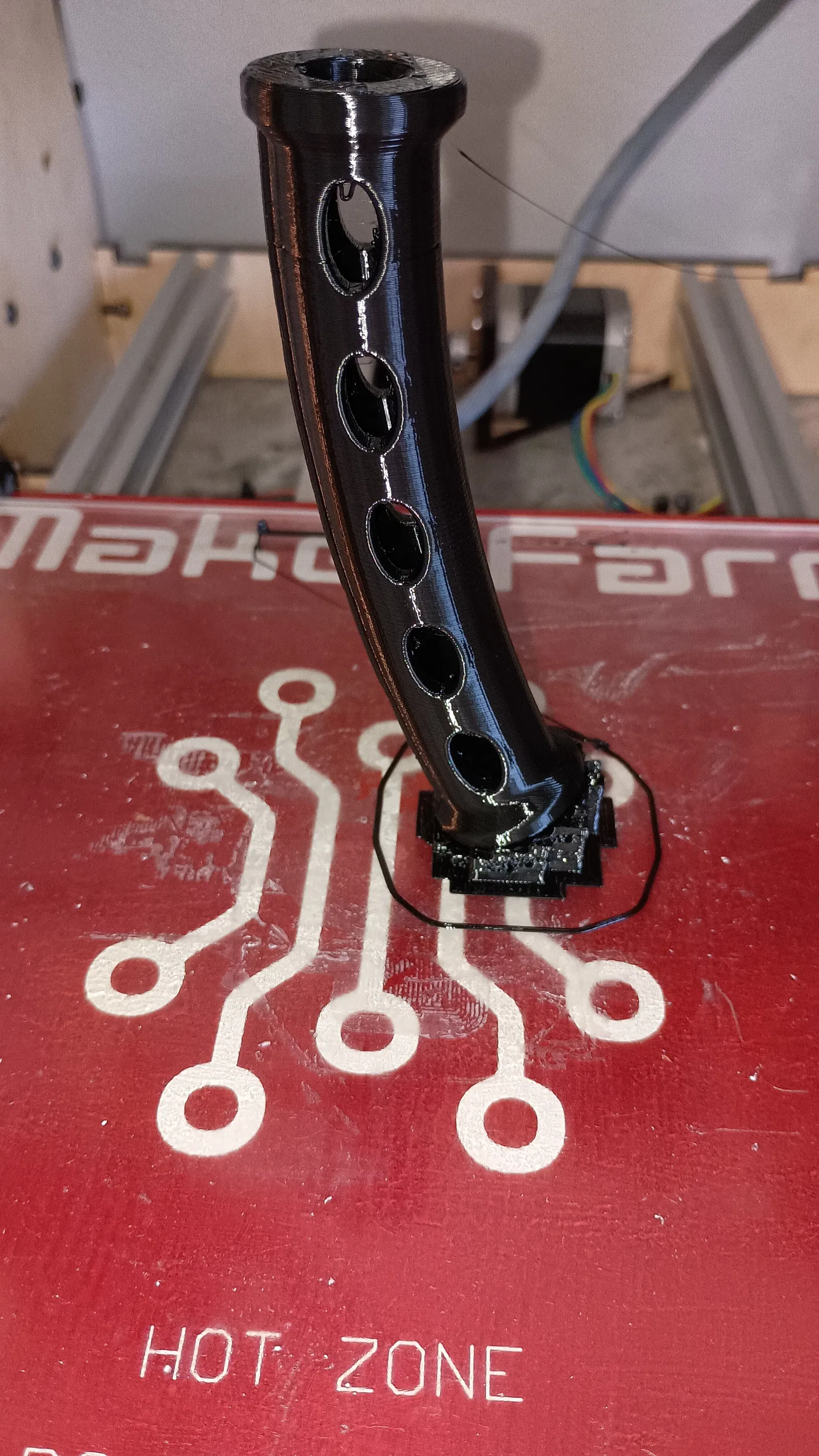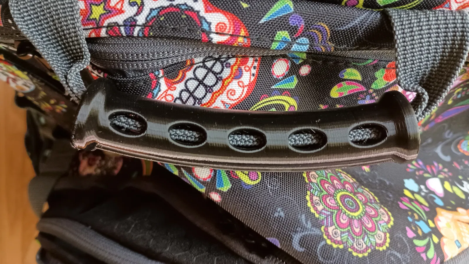 Thiết kế để in bằng vật liệu có độ dẻo nhất định nhằm luồn qua phần quai xách bằng vải dệt của balo. Mẫu này in TPU rất “dễ chịu”, vì không ngại mấy lỗi như blobs, boogers, strings và oozing; mấy thứ đó còn làm tăng độ bám như tạo texture. Phần cong có bán kính 220mm, mục đích là giúp nó ôm và bám trên quai. Miếng bọc được rạch một đường ở phía trên. Nếu bạn lo nó bị tuột, luồn một sợi zip tie qua mỗi đầu rồi giấu phần khóa (đầu zip tie) vào bên trong.