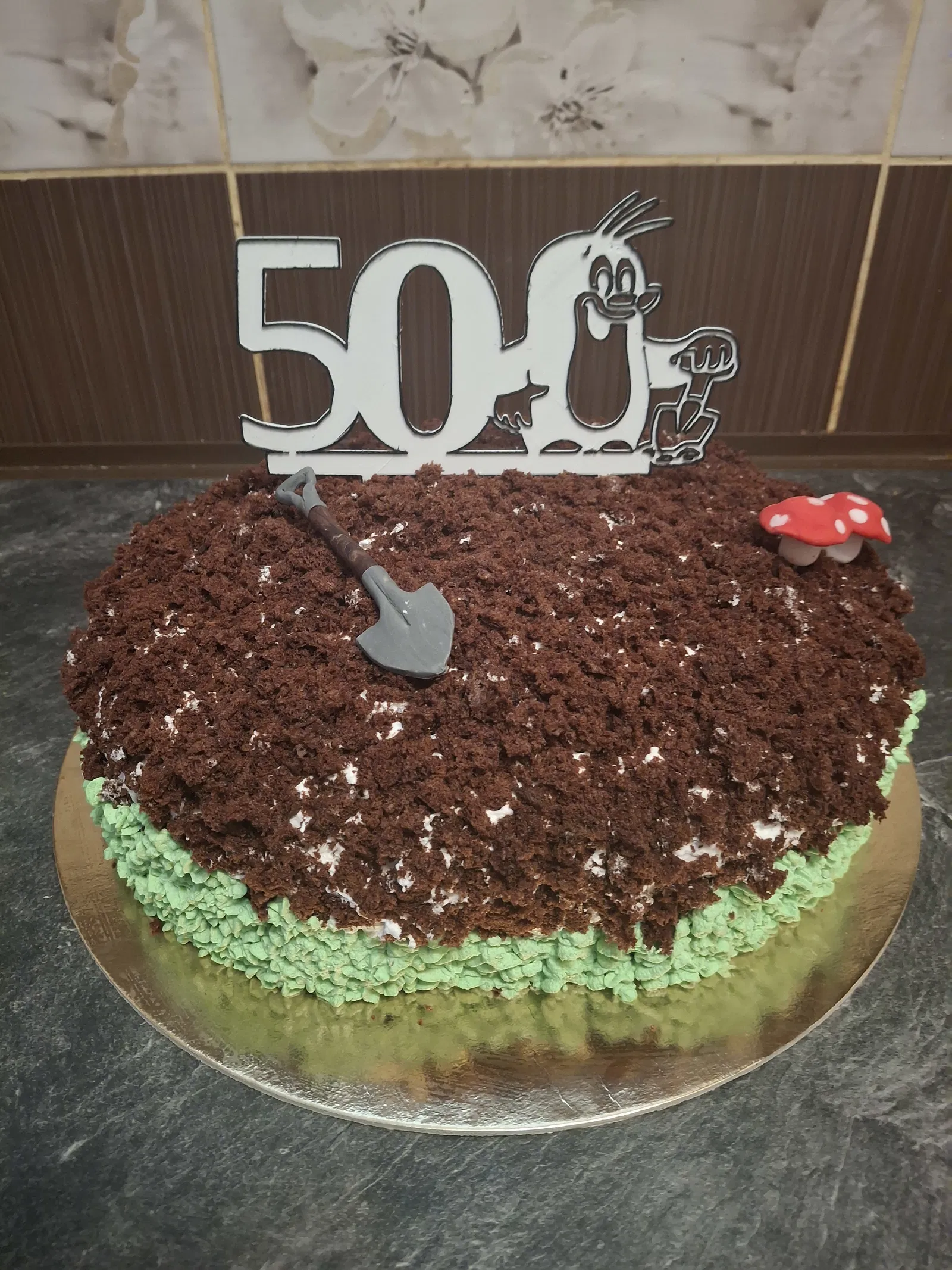 Mẫu cake topper sinh nhật 50 tuổi này có nhân vật chuột chũi vui nhộn, rất hợp cho người mê làm vườn, yêu thiên nhiên, hoặc ai thích trang trí bánh kiểu dễ thương.