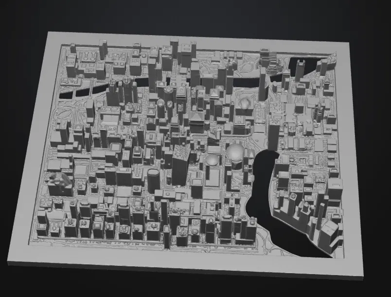 Tranh bas-relief 3D in được, tái hiện skyline downtown Chicago nhìn từ Lake Michigan với Willis Tower, Hancock, Aon, Trump và Vista. Có backplate phẳng dễ treo, gợn sóng hồ nhẹ; in nhanh, ít supports, hợp PLA.
