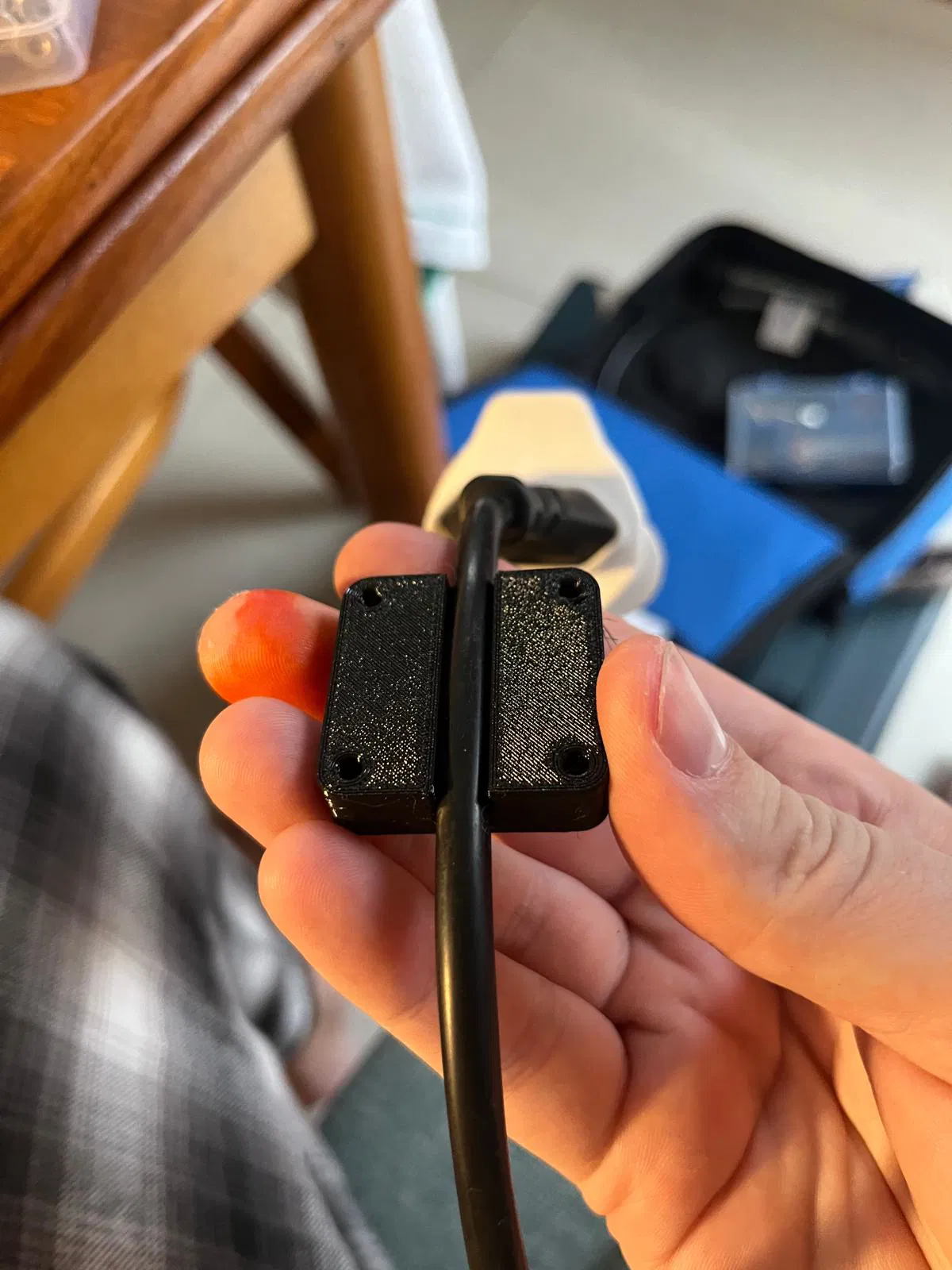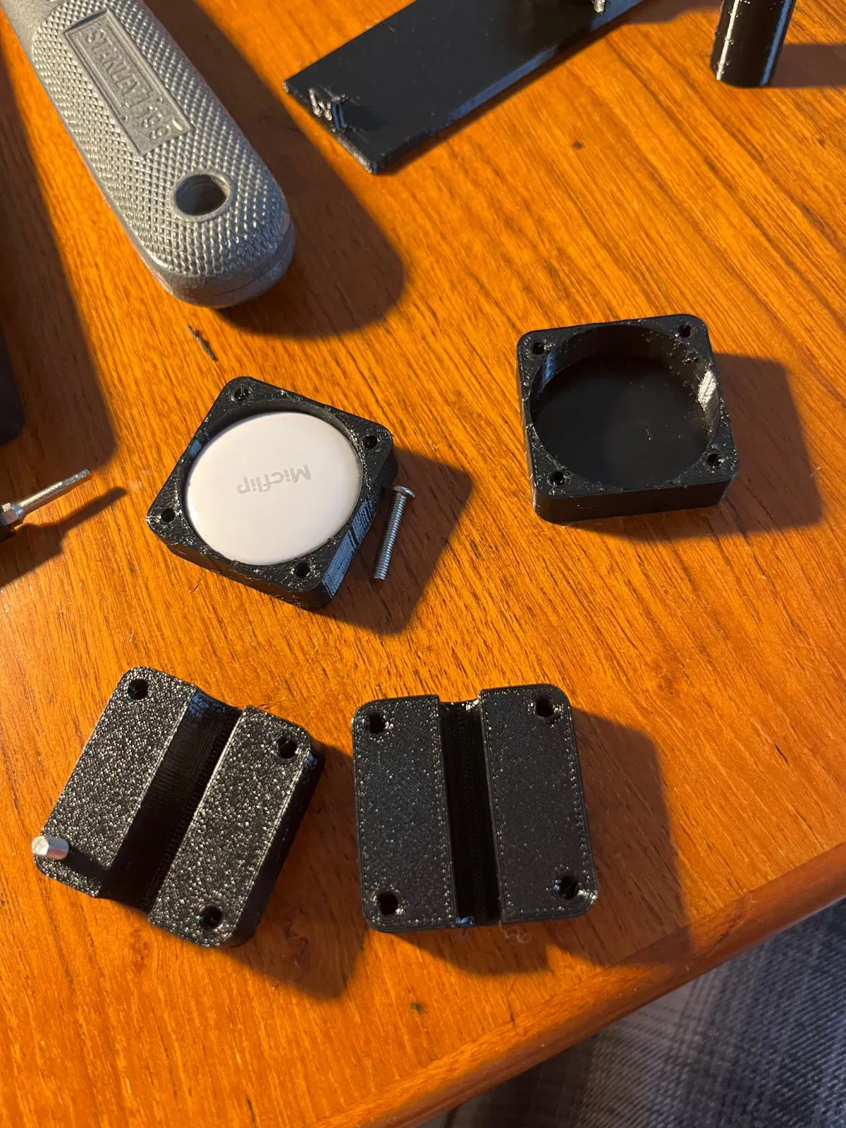 Mẫu giá đỡ AirTag gắn lên dây nguồn hoặc dây của dụng cụ điện để chống trộm. Có 2 bản cho cáp dày 8mm và 6mm, dùng 4 vít M3x16 đầu siêu phẳng (1mm). Hỗ trợ AirTag và clone Micflip.