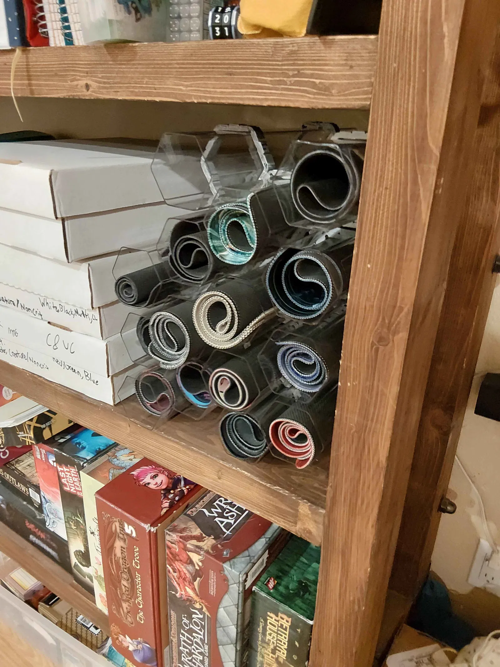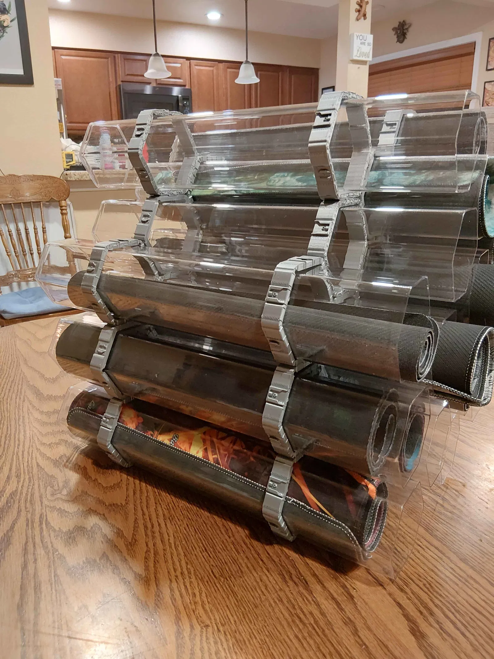 Mình ráp mấy cái brace khóa liên động này để sắp xếp đống playmat và playmat holder siêu nhiều của mình với bạn cùng phòng. Mình mua mấy cái này - https://a.co/d/2v5leLs - rồi thiết kế theo nó. Nó là kiểu lắp ma sát hơi lỏng (loose friction fit), nên vẫn có thể giật nguyên cả ống ra mang theo.