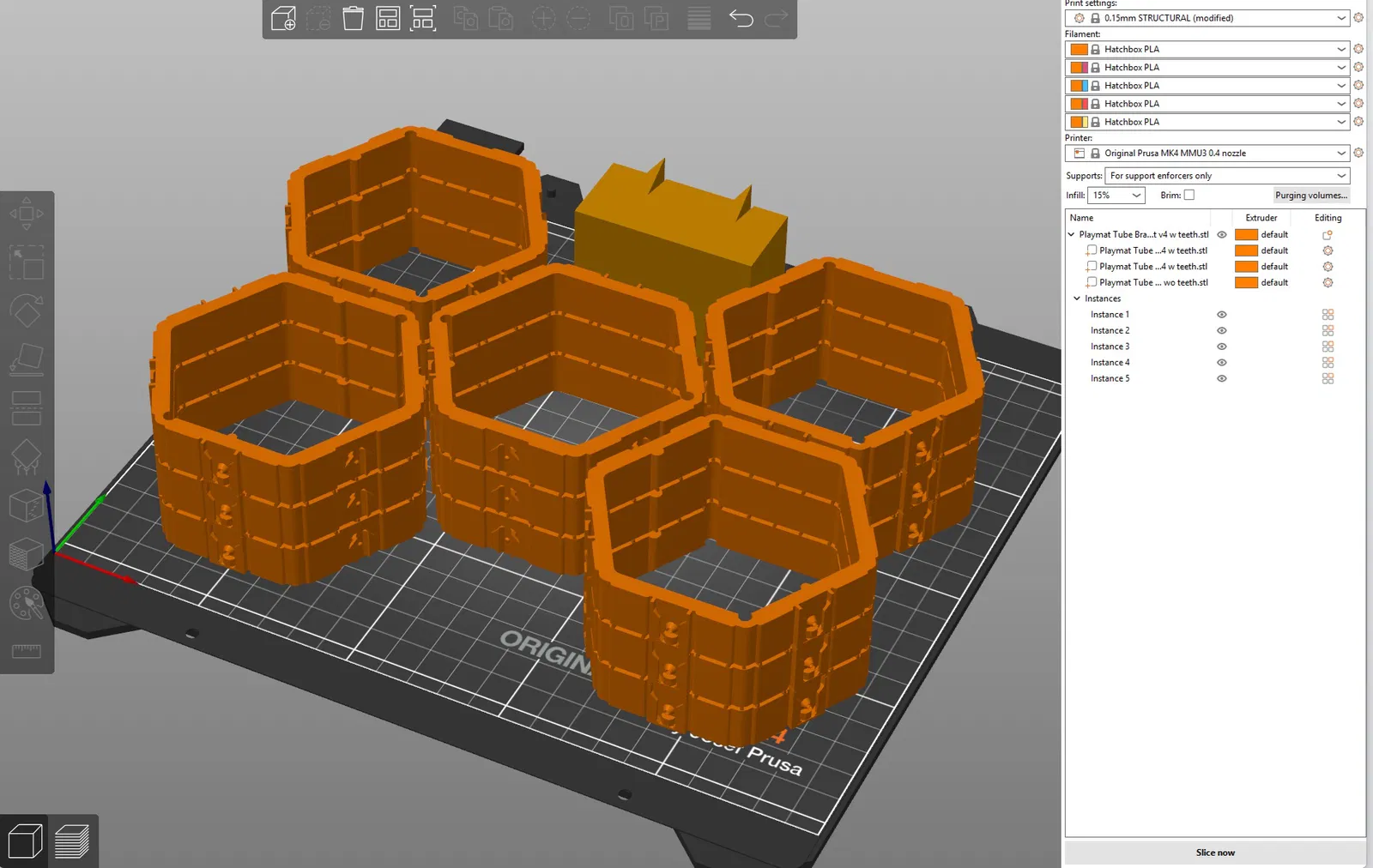 Nếu bạn chỉ cần lấp kín mặt bàn in (fill your bed) thì chọn bản No Teeth. Còn nếu muốn làm nhanh cho được nhiều, bắt đầu bằng cách mở 1 bản With Teeth trong slicer. Sau đó thêm một part vào, rồi load thêm cái nữa cái nữa, chỉnh height cho phù hợp để mỗi cái in lên phần “teeth” của cái bên dưới. Cái trên cùng vẫn nên là No Teeth. Khi mình đã có một chồng rồi thì bấm “fill bed” để nó tự nhân ra nhiều bản cho mình. Với mình thì mấy cái này in khá vững, chỉ có chút bridging bị chảy nhão, và bẩy ra cái rụp bằng tua vít dẹp (flat head screwdriver).