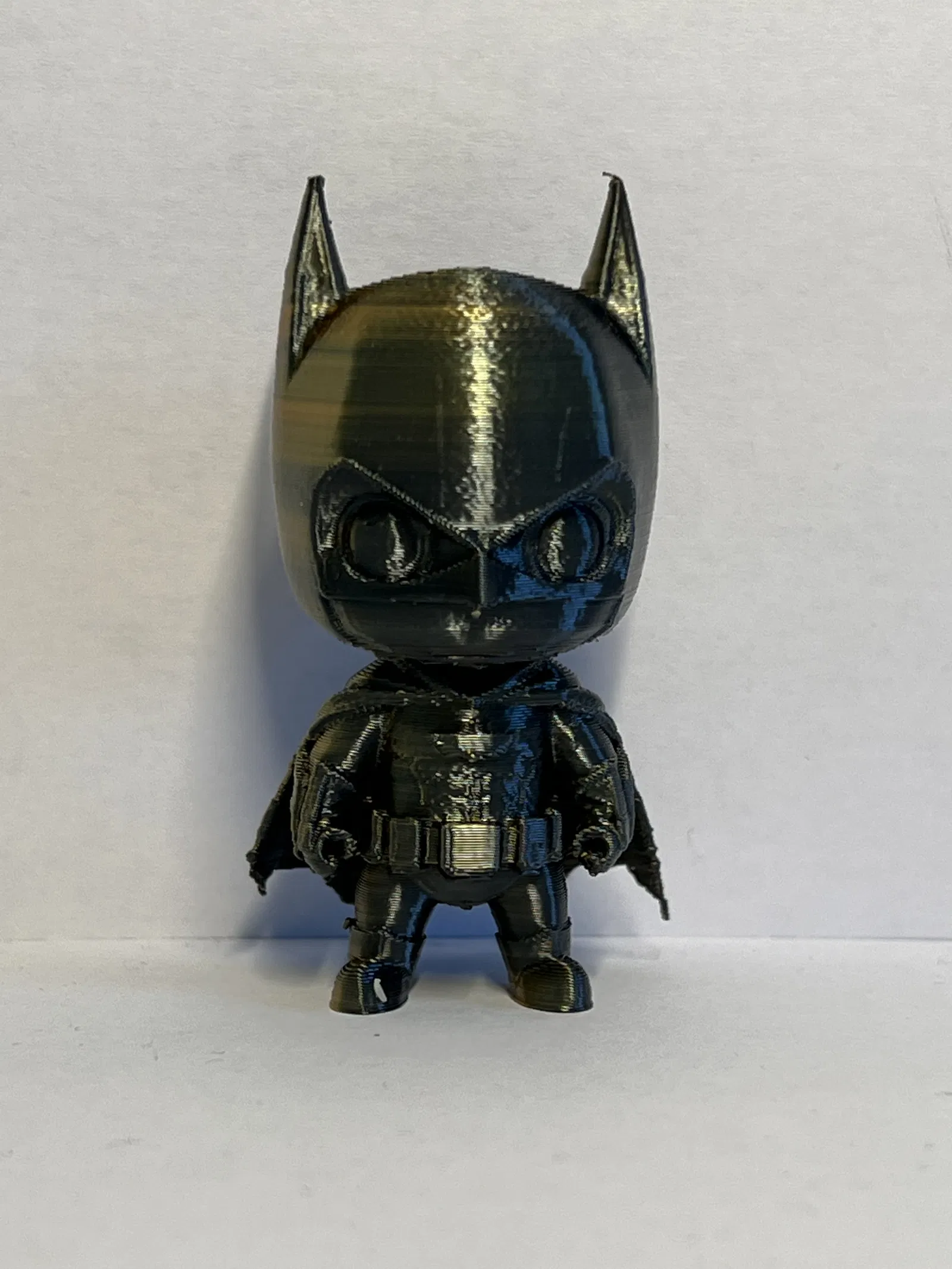 Mẫu figurine 3D Chibi Batman được AI tạo ra, phù hợp để in trang trí. Tác giả in trên máy in hơi cũ và thường in kích thước nhỏ; ảnh chỉ mang tính minh hoạ để xác nhận model in được ổn.