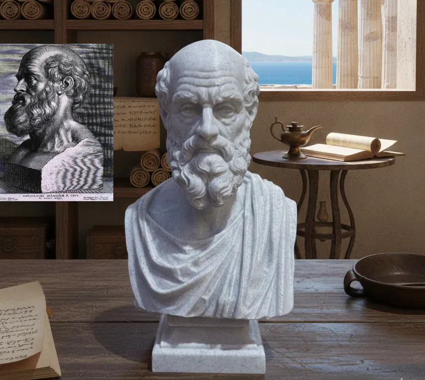 Tượng bán thân này khắc họa Hippocrates xứ Kos, nhân vật đặt nền móng cho y học phương Tây, trong một diễn giải điêu khắc tiết chế và trung thành với tinh thần cổ điển. Tác phẩm dựa trên hình tượng phổ biến và được công nhận rộng rãi nhất của nhân vật lịch sử, vốn thường gắn với các tượng bán thân cổ được cho là của Hippocrates, nhận diện qua đường nét già dặn, bộ râu rậm và ánh nhìn trầm ngâm.