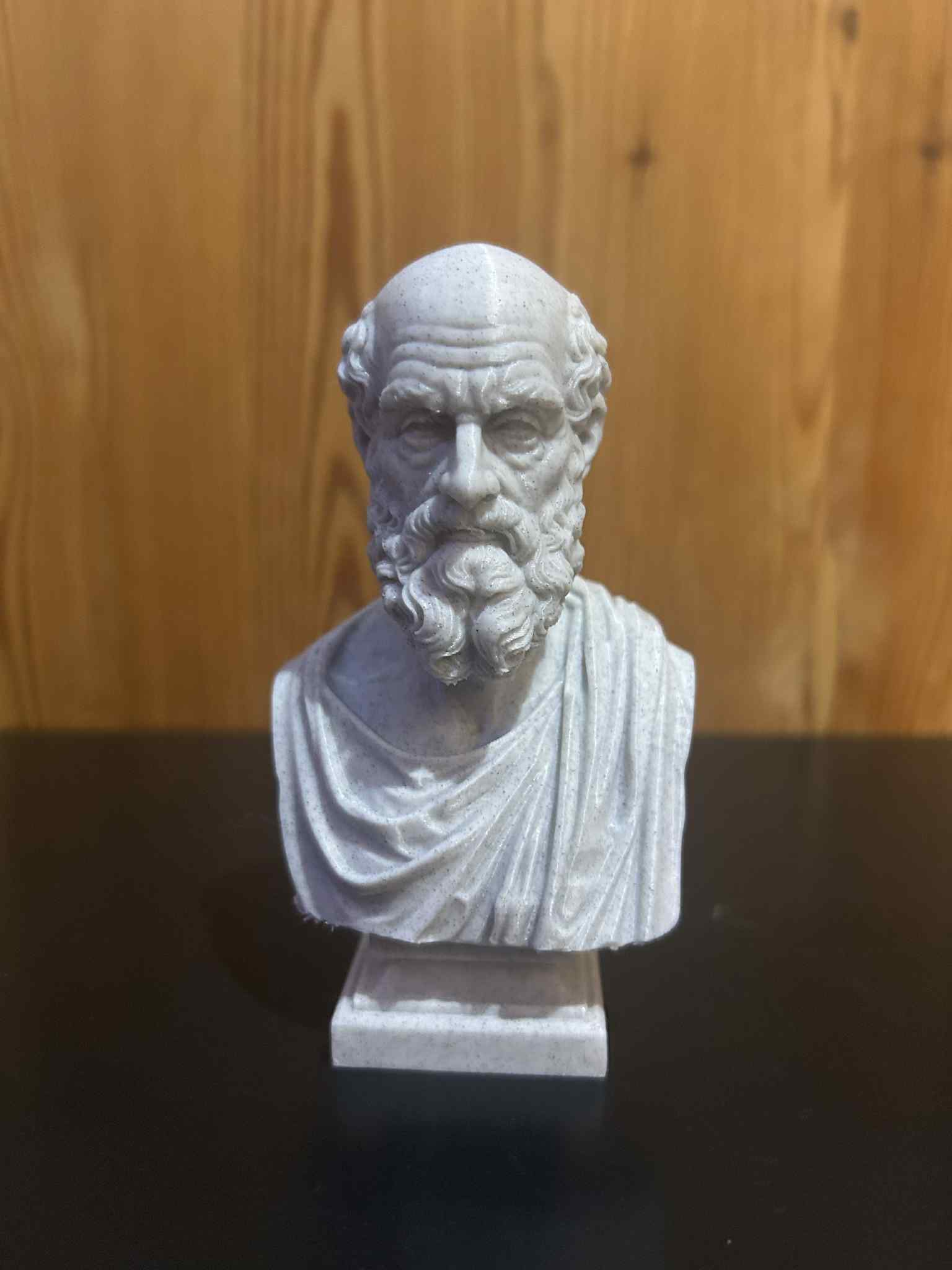 Tượng bán thân Hippocrates xứ Kos theo phong cách cổ điển, dựa trên hình tượng phổ biến nhất với gương mặt già dặn, râu dày và nét trầm tư. Thiết kế cho in 3D, tôn vinh di sản y học và _Lời thề Hippocrates_.