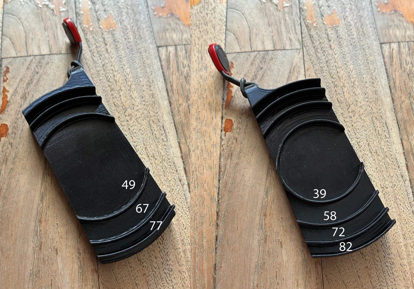 Giá giữ nắp ống kính đa cỡ 39–82mm, thiết kế có rãnh bám vào phần gân của lens cap để giữ chắc hơn. Dùng loop để gắn quick release (vd Peak Design anchors). Khuyến nghị in đứng, loop úp xuống build plate.