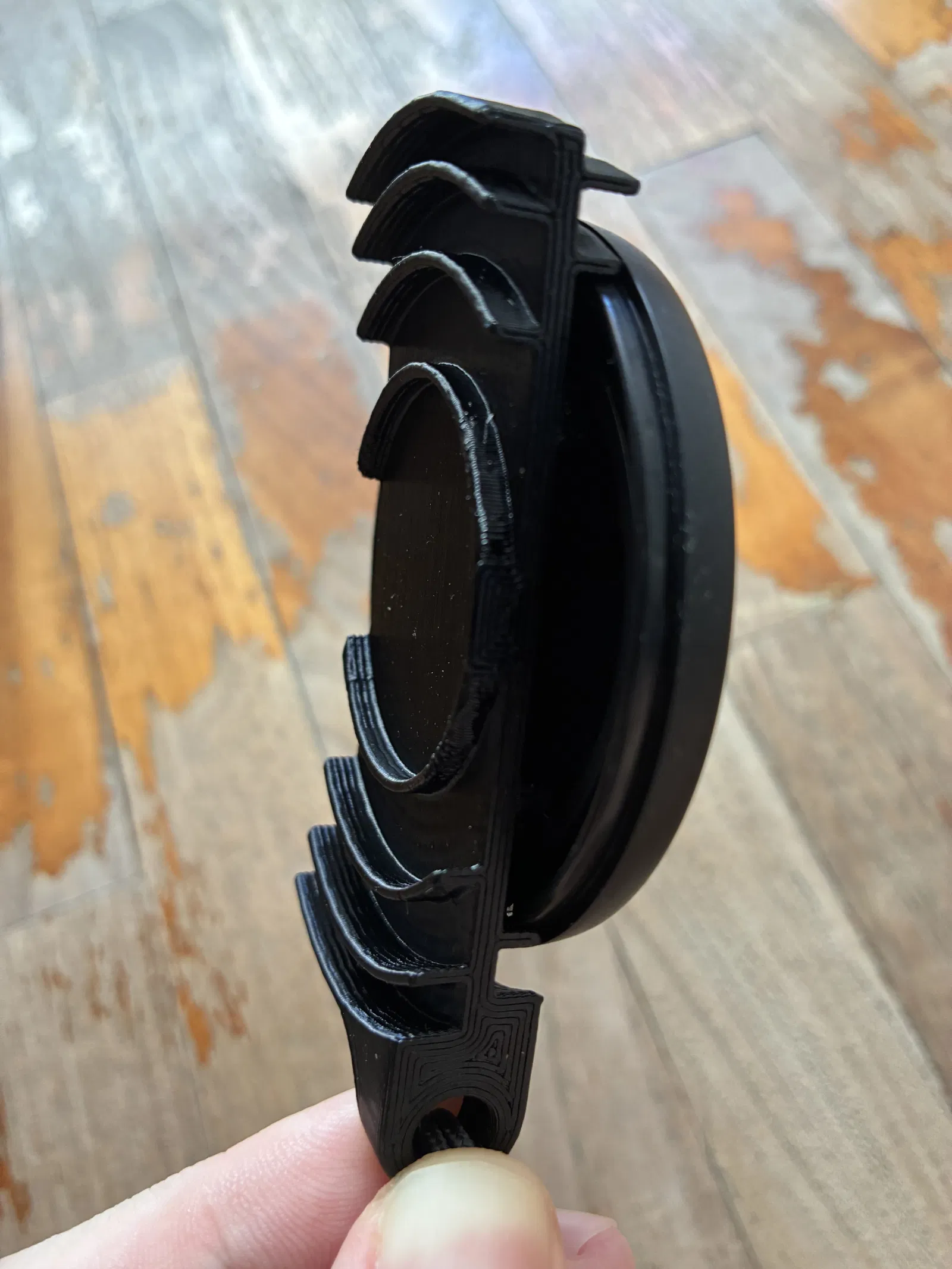 Mình không tìm được mẫu lens cap holder nào có: 1) dải đường kính nắp ống kính như mình đang dùng, 2) giữ nắp chắc hơn, ví dụ có các rãnh (grooves) ăn khớp vào phần gân/rãnh bám tay của nắp ống kính, và 3) có loop để gắn quick release (vd. anchor của Peak Design). Nên đây là phiên bản lens cap holder theo ý mình.