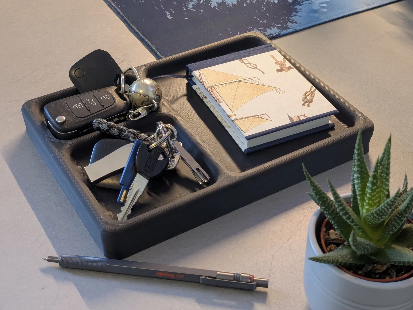 Khay EDC (EDC Valet Tray) thiết kế tối giản, có độ nâng đẹp và các ngăn tiện dụng để đựng chìa khóa, ví, đèn pin/bút. Giúp gom “pocket dump” gọn gàng, dễ lấy và hạn chế trầy xước.