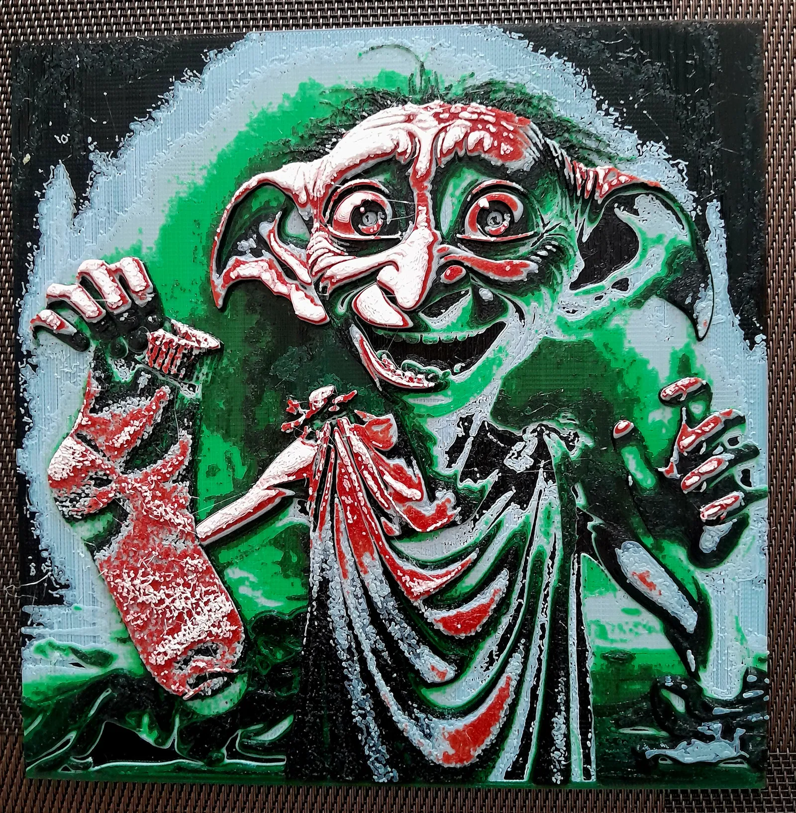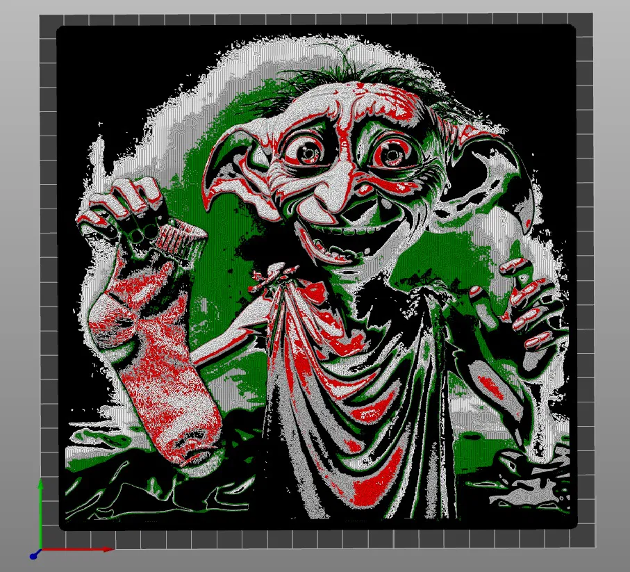 Mô hình Dobby the elf với một chiếc vớ, in trên máy 3D monochrome. Có hướng dẫn đổi màu theo từng layer (Black/White/Gray/Green/Red) và thông số in gợi ý: 70% infill, layer height 0.1mm, base 0.2mm.