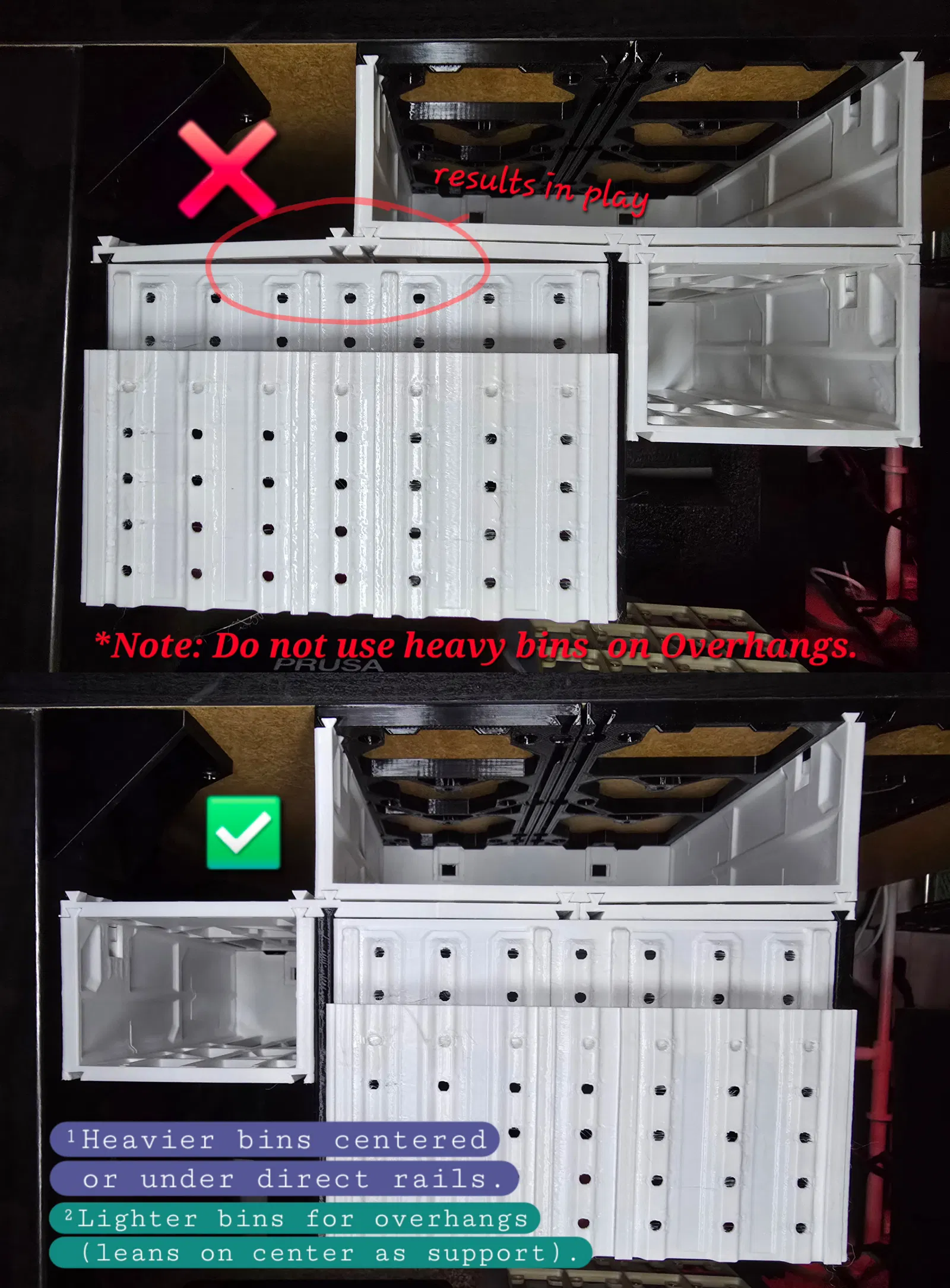 • Thay vào đó, đảm bảo các bin cao/nặng được đặt ở giữa hoặc được đỡ bởi một rail gắn trực tiếp phía trên.