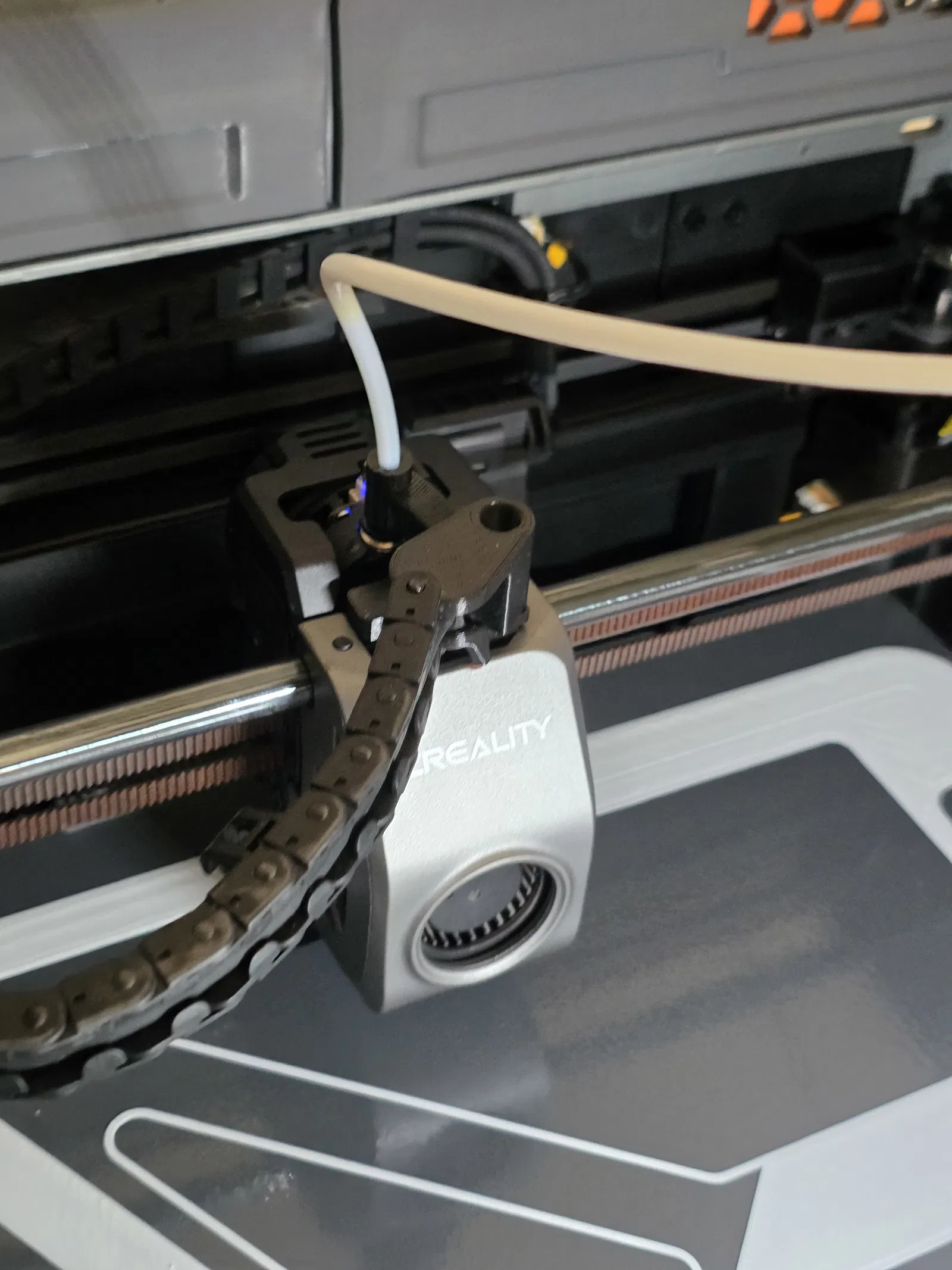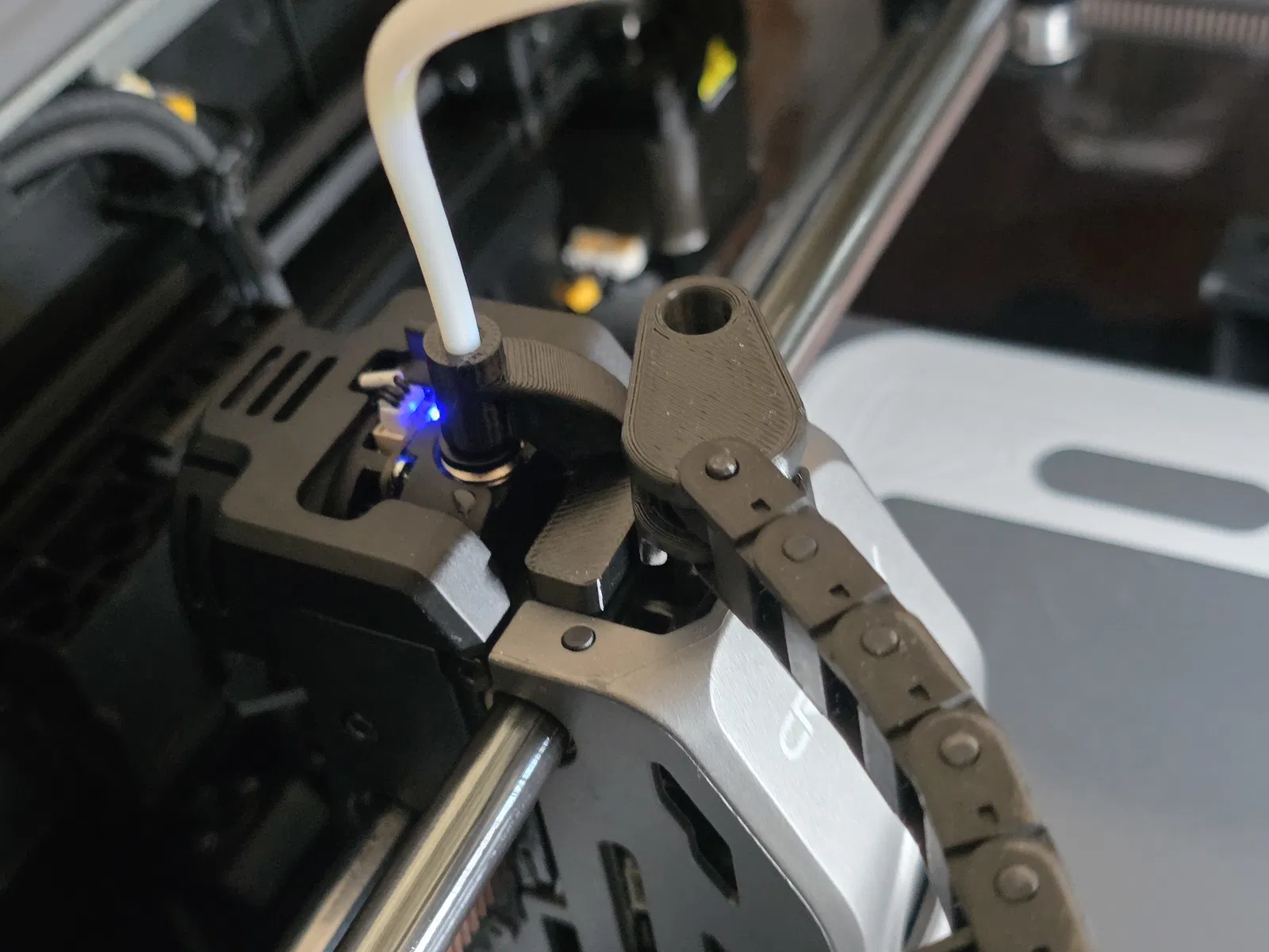 Extruder CFS cao hơn chút so với extruder zin. File STL gốc sẽ đè vào vòng khí nén (pneumatic ring) khi siết chặt xích cáp (cable chain), làm ống PTFE bị bật lên. Nên mình cắt bớt phần đáy của ngàm giữ ống 2mm, và tăng chiều dài phần trên thêm 3mm. Nhờ vậy nó không còn đẩy vòng khí nén xuống và PTFE đứng yên đúng vị trí, trong khi phần trên giúp sợi filament đi vào extruder dễ hơn mà không cần máy phải di chuyển để canh thẳng filament. Mình hết hẳn lỗi khi đổi filament và thời gian đổi filament cũng nhanh hơn. Ngoài ra còn giảm lực căng lên motor CFS và hạn chế đầu nối khí nén (pneumatic connector) bị bung ra do lực thẳng đứng tác động.