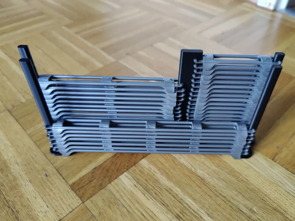 Giải pháp gọn gàng để sắp xếp rail Gravitrax size 1/2/3 với footprint chỉ 4x22 cm. Chứa tối đa 20 rail mỗi size, in khoảng 1h30, tốn ~31g PLA. Cao 105 mm vừa hộp starter-set, dễ lấy và di chuyển không rơi.