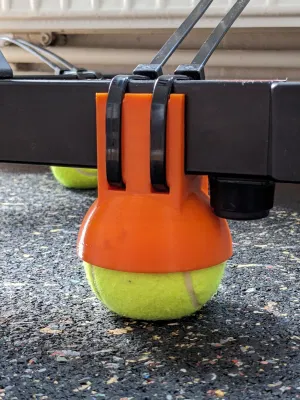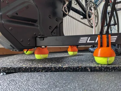 Adapter giúp đặt Elite Suito smart trainer lên bóng tennis để tăng độ lắc ngang và giảm tiếng ồn/rung truyền xuống sàn. Dùng 4 cái, siết bằng cable tie 7,5 mm; khuyến nghị in PETG infill 100%.