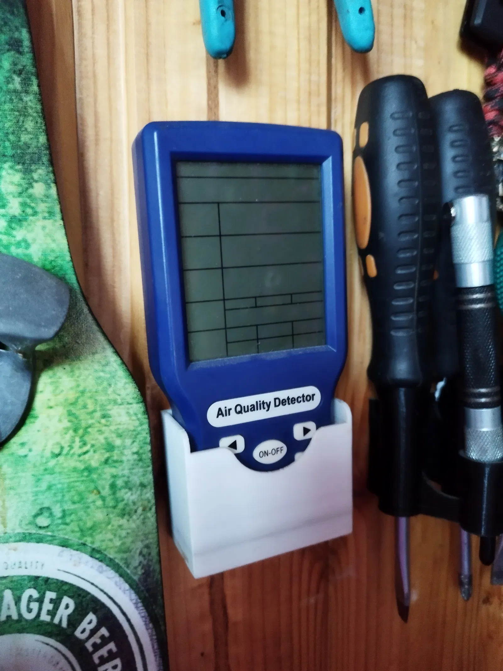 Mẫu giá treo gắn tường dành cho thiết bị/cảm biến đo chất lượng không khí, giúp cố định gọn gàng và đặt đúng vị trí để theo dõi chỉ số không khí trong phòng.